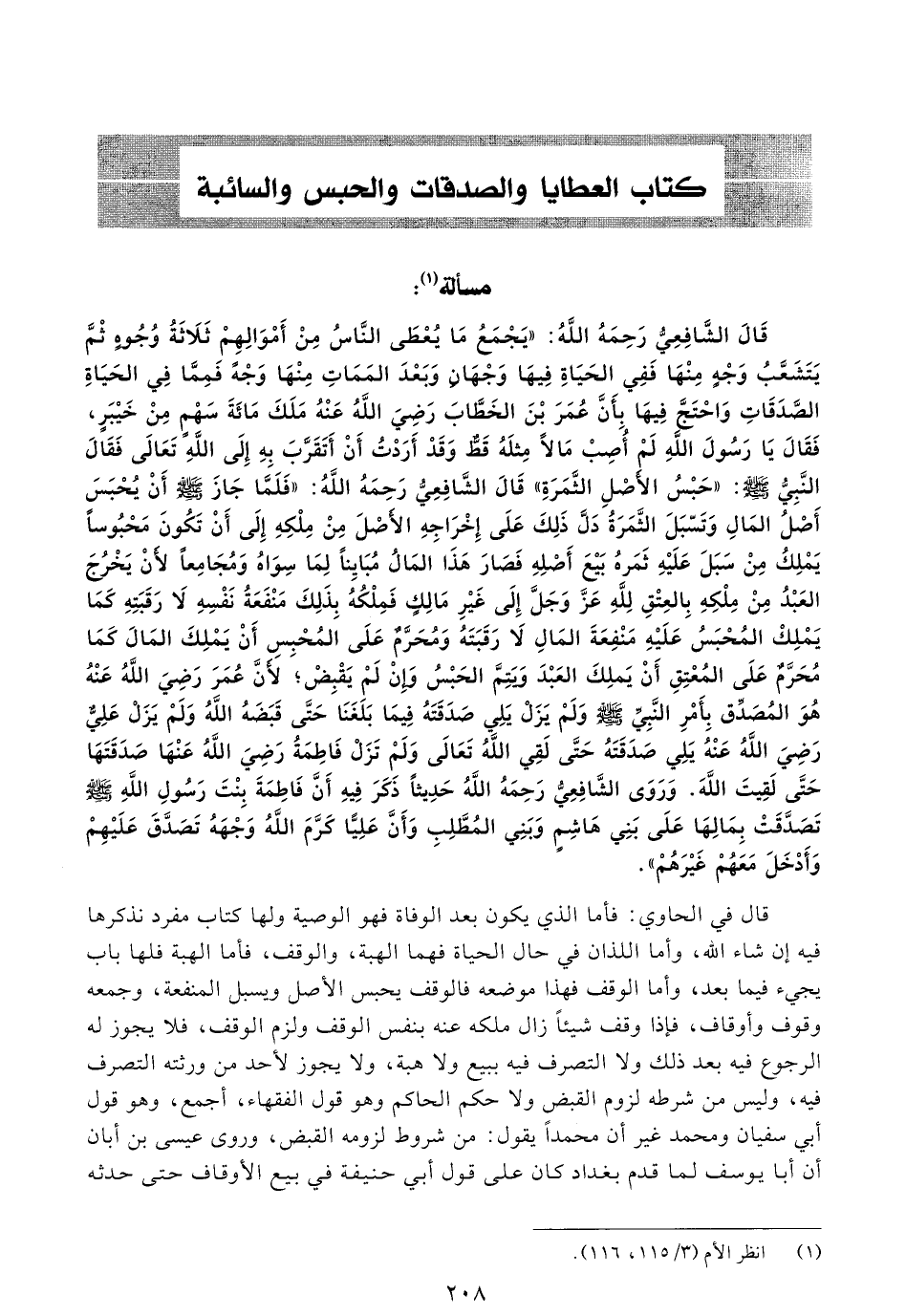 قَالَ الشَّافِعِيُّ رَحِمَهُ اللَّهُ: "يَجْمَعُ مَا يُعْطَى النَّاسُ مِنْ أَمْوَالِهِمْ ثَلَاثَةُ وُجُوهٍ ثْمَّ يَتَشَعَّبُ وَجْهٍ مِنْهَا فَفِي الحَيَاةِ وَجْهَانِ وَبَعْدَ المَمَاتِ مِنْهَا وَجْهً فَمِمَّا فِي الحَيَاةِ الصَّدَقَاتِ وَاحْتَجَّ فِيهَا بِأَنَّ عُمَرَ بْنَ الخَطَّابَ رَضِيَ اللَّهُ عَنْهُ مَلَكَ مَائَةَ سَهْمٍ من مِنْ خَيْبَرَ، فَقَالَ: يَا رَسُولَ اللَّهِ، لمْ أُصِبْ مَالًا مِثْلَهُ قَطُّ, وَقَدْ أَرَدْتُ أَنْ أَتَقَرَّبَ بِهِ إِلَى اللَّهِ تَعَالَى، فَقَالَ النَّبِيُّ صَلَّى اللَّهُ عَلَيْهِ وَسَلَّمَ: "حَبْسُ الْأَصْلِ الثَّمَرَةِ" قَالَ الشَّافِعِيُّ رَحِمَهُ اللَّهُ: "فَلَمَّا جَازَ صَلَّى اللَّهُ عَلَيْهِ وَسَلَّمَ أَنْ يُحْبَسَ أَصْلَ الْمَالِ وَتَسّبَلَ الثَّمَرَةُ دَلَّ ذَلِكَ عَلَى إِخْرَاجِهِ الأَصْلَ مِنْ مِلْكِهِ إِلَى أَنْ يَكُونَ مَحْبُوسًا لَا يَمْلِكُ مَنْ سَبَّلَ عَلَيْهِ ثَمَرَهُ بَيْعَ أَصْلِهِ، فَصَارَ هَذَا الْمَالُ مُبَايِنًا لِمَا سِوَاهُ وَمُجَامِعًا لَأَنْ يَخْرُجَ الْعَبْدُ مِنْ مِلْكِهِ بِالْعِتْقِ لِلَّهِ عَزَّ وَجَلَّ إِلَى غَيْرِ مَالِكٍ، فَمَلَّكَهُ بِذَلِكَ مَنْفَعَةَ نَفْسِهِ لَا رَقَبَتَهُ كَمَا يَمْلِكْ المُحْبَسُ عَلَيْهِ مَنْفَعَةَ الْمَالِ لَا رَقَبَتَهُ، وَمُحَرَّمٌ عَلَى الْمُحَبِّسِ أَنْ يَمْلِكَ الْمَالَ كَمَا مُحَرَّمٌ عَلَى الْمُعْتِقِ أَنْ يَملِكَ العَبْدَ وَيَتِمَّ الحَبْسُ وَإِنْ لَمْ يَقْبِضْ؛ لأَنَّ عُمَرَ رَضِيَ اللَّهُ عًنْهُ هُوَ المُصَدِّق بِأَمْرِ النَّبِيَّ صلى الله عليه وسلم وَلَمْ يَلِي صَدَقَتَهُ فِيمَا بَلَغَنَا حَتَّى قَبَضَهُ اللَّهُ وَلَمْ يَزَلْ عَلِيٌّ رَضِيَ اللَّهُ عَنْهُ يَلِي صَدَقَتَهُ حَتَّى لَقِي اللَّهُ تَعَالَى وَلَمْ تَزَلْ فَاطِمَةُ رَضِيَ اللَّهُ عَنْهَا صَدَقَتَهَا حَتَّى لَقِيتَ اللَّهَ. وَرَوَى الشَّافِعِيُّ رَحِمَهُ اللَّهُ حَدِيثًا ذَكَرَ فِيهِ أَنَّ فَاطِمَةَ بِنْتَ رَسُولِ اللَّهِ صلى الله عليه وسلم تَصَدَّقَتْ بِمَالِهَا عَلَى بَنِي هَاشِمٍ وَبَنِي هَاشِمٍ وَبَنِي المًطَّلِبِ وَأَنَّ عَلِيًّا كَرَّمَ اللَّهُ وَجْهَهُ تَصَدَّقَ عَلَيْهِمْ وَأَدْخَلَ مَعَهُمْ غَيْرَهُمْ".