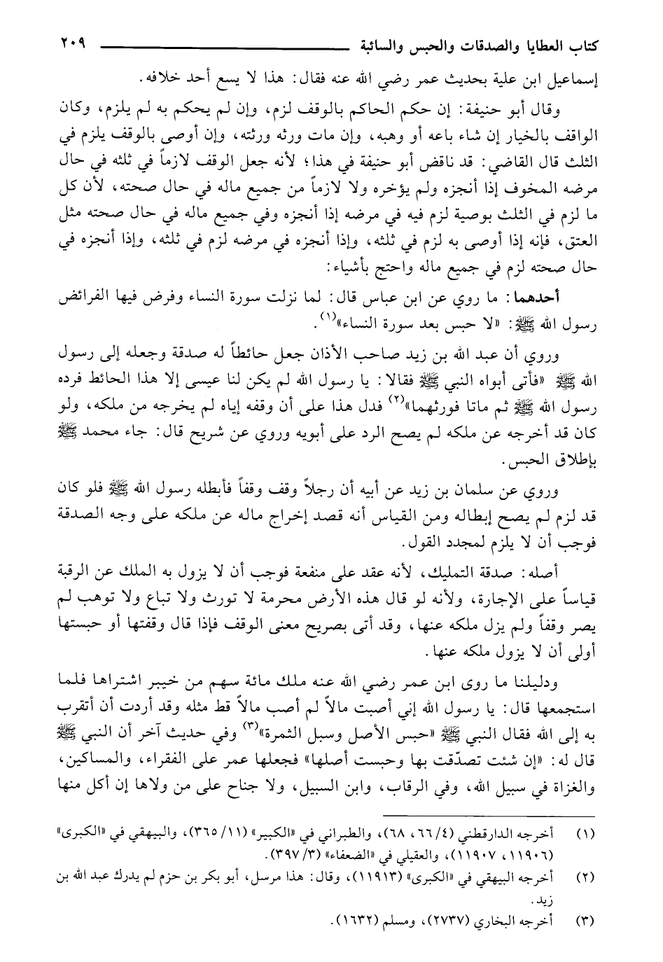 ودليلنا ما روى ابن عمر رضي الله عنه ملك مائة سهم من خيبر اشتراها فلما استجمعها قال: يا رسول الله إني أصبت مالًا لم أصب مالًا قط مثله وقد أردت أن أتقرب به إلى الله فقال النبي صلى الله عليه وسلم "حبس الأصل وسبل الثمرة" وفي حديث آخر أن النبي صلى الله عليه وسلم قال له: "إن شئت تصدّقت بها وحبست أصلها" فجعلها عمر على الفقراء، والمساكين، والغزاة في سبيل الله، وفي الرقاب، وابن السبيل، ولا جناح على من ولاها إن أكل منها