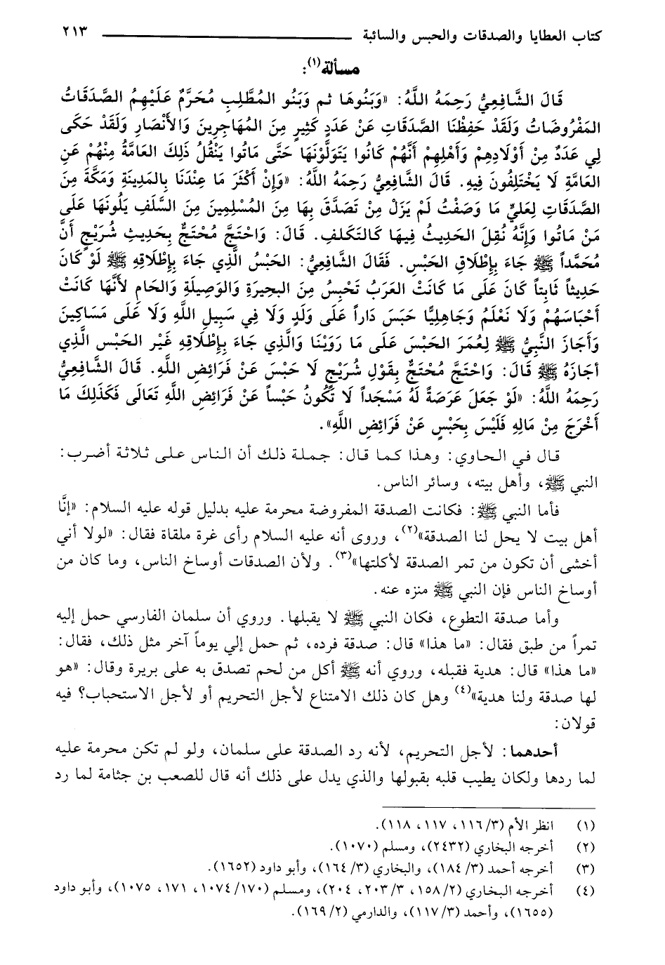 قَالَ الشَّافِعِيُّ رَحِمَهُ اللَّهُ: "وَبَنُوهَا ثم وَبَنُو المُطَّلِبِ مُحَرَّمٌ عَلَيْهمُ الصَّدَقَاتُ المَفْرُوضَاتُ وَلَقَدْ حَفظْنَا الصَّدَقَاتِ عَنْ عَدَدٍ كَثِيرٍ مِنَ المُهَاجِرِينَ وَالأَنْصارِ وَلَقَدْ حَكَي لِي عَدَدٌ مِنْ أَوْلَادِهِمْ وَأَهْلِهِمْ أَنَّهُمْ كَانُوا يَتَوَلَّوْنَهَا حَتَّى مَاتُوا يَنْقُلُ ذّلِكَ العَامَّةُ مِنْهُمْ عَنِ العَامَّةِ لَا يَخْتَلِفُونَ فِيهِ. قَالَ الشَّافِعِيُّ رّحِمَهُ اللَّهُ: "وَإِنْ أَكْثَرَ مَا عِنْدَنَا بِالمَدِينَةِ وَمَكَّةَ مِنَ الصَّدَقَاتِ لِعَليٍّ مَا وَصَفْتُ لَمْ يَزَلْ مِنْ تَصَدَّقَ بِهَا مِنَ المُسْلِمِينَ مِنَ السَّلَفِ يَلُونَهَا عَلَى مَنْ مَاتُوا وَإِنَّهُ نُقِلَ الحَدِيثُ فِيهَا كَالتَكَلفِ. قَالَ: وَاحْتَجَّ مُحْتَجُّ بِحَدِيثِ شُرَيْج أَنَّ مُحَمَّدًا صلى الله عليه وسلم جَاءَ بِإِطْلاَقِ الحَبْسِ. فَقَالَ الشَّافِعِيُّ: الحَبْسُ الذِي جَاءَ بإطْلاقِهِ صلى الله عليه وسلم لَوْ كَانَ حَدِيثًا ثَابِتًا كَانَ عَلَى مَا كَانَتْ العَرَبُ تَحْبِسُ مِنَ البحِيرَةِ وَالوَصِيلَةِ وَالحَامِ لأَنَّهَا كَانَتْ أَحْبَاسَهُمْ وَلَا نَعْلَمُ وَجَاهِلِيًّا حَبَسَ دَارًا عَلَى وَلَدٍ وَلَا فِي سَبِيلِ اللَّهِ وَلَا عَلَى مَسَاكِينَ وَأَجَازَ النَّبِيُّ صلى الله عليه وسلم لِعُمَرَ الحَبْسَ عَلَى مَا رَوَيْنَا وَالَّذِي جَاءَ بِإِطْلاَقِهِ غَيْر الحَبْس الَّذِي أجَازَهُ صلى الله عليه وسلم قَالَ: وَاحْتَجَّ مُحْتَجٍّ بِقَوْلِ شُرَيْجٍ لَا حَبْسَ عَنْ فَرَائِضِ اللَّهِ. قَالَ الشَّافِعِيُّ رَحِمَهُ اللَّهُ: "لَوْ جَعَلَ عَرَصَةً لَهُ مَسْجَدًا لَا تكُونُ حَبْسًا عَنْ فَرائِضِ اللَّهِ تَعَالَى فَكَذَلِكَ مَا أَخْرَجَ مِنْ مَالِهِ فَلَيْسَ بِحَبْسٍ عَنْ فَرائِضِ اللَّهِ".