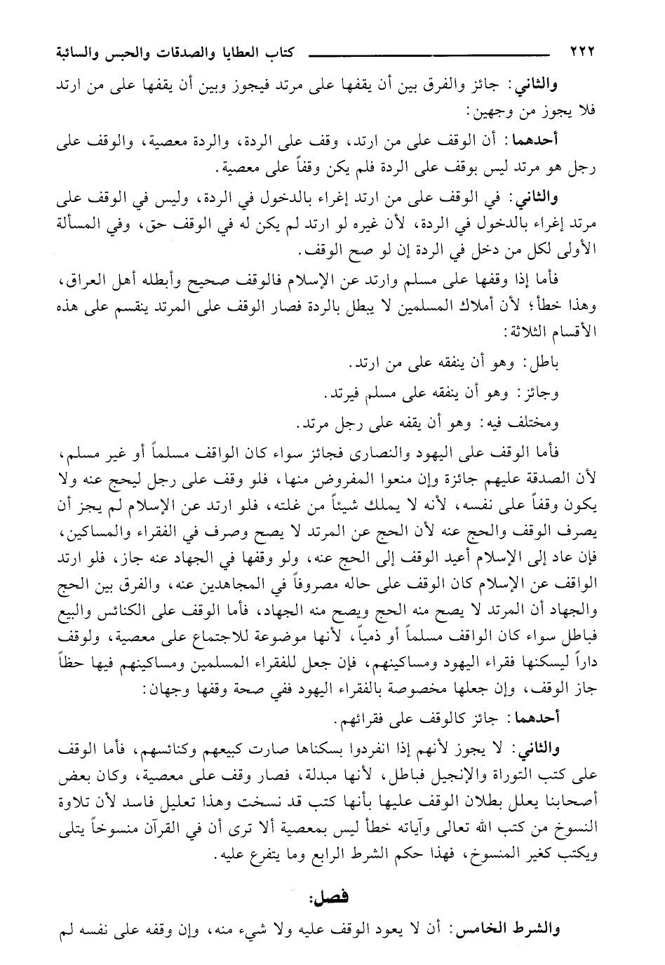 والثاني: لا يجوز لأنهم إذا انفردوا بسكناها صارت كبيعهم وكنائسهم, فأما الوقف على كتب التوراة والإنجيل فباطل، لأنها مبدلة, فصار وقف على معصية, وكان بعض أصحابنا يعلل بطلان الوقف عليها بأنها كتب قد نسخت وهذا تعليل فاسد لأن تلاوة النسوخ من كتب الله تعالى وآياته خطأ ليس بمعصية ألا ترى أن في القرآن منسوخاً يتلى ويكتب كغير المنسوخ، فهذا حكم الشرط الرابع وما يتف ع عليه.