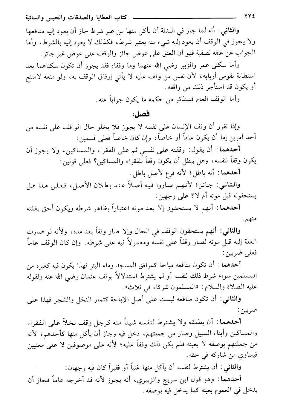 أحدهما: أن تكون منافعه مباحة كمرافق المسجد وماء البئر فهذا يكون فيه كغيره من المسلمين سواء شرط ذلك لنفسه أو لم يشترط استدلالاً بوقف عثمان رضي الله عنه ولقوله عليه الصلاة والسلام: "المسلمون شركاء في ثلاث".