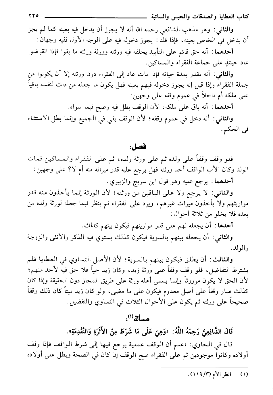 قال في الحاوي: اعلم أن الوقف عملية يرجع فيها إلى شرط الواقف فإذا وقف أولاده وكانوا موجودين ثم على الفقراء صح الوقف إن كان في الصحة وبطل على أولاده