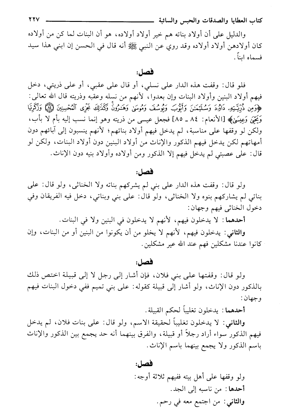 فلو قال: وقفت هذه الدار على نسلي، أو قال على عقبي، أو على ذريتي، دخل فيهم أولاد البنين وأولاد البنات وان بعدوا، لأنهم من نسله وعقبه وذريته قال الله تعالى: {ومِن ذُرِّيَّتِهِ دَاوُودَ وسُلَيْمَانَ وأَيُّوبَ ويُوسُفَ ومُوسَى وهَارُونَ وكَذَلِكَ نَجْزِي المُحْسِنِينَ [84] وزَكَرِيَّا ويَحْيَى وعِيسَى} [الأنعام: (84) - 85] فجعل عيسي من ذريته وهو إنما نسب إليه بأم لا بأب، ولكن لو وقفها على مناسبة، لم يدخل فيهم أولاد بناتهم, لأنهم ينبون إلى آبائهم دون أمهاتهم لكن يدخل فيهم الذكور والإناث من أولاد البنين دون أولاد البنات, ولكن لو قال: على عصبتي لم يدخل فيهم إلا الذكور ومن أولاده وأولاد بنيه دون الإناث.