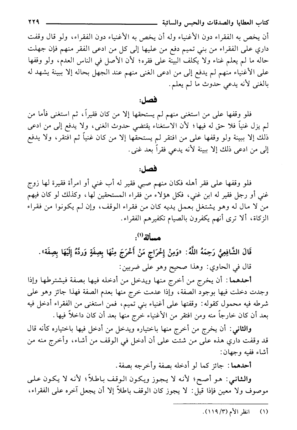 أن يخص به الفقراء دون الأغنياء وله أن يخص به الأغنياء دون الفقراء, ولو قال وقنت داري على الفقراء من بني تميم دفع من عليها إلى كل من ادعى الفقر منهم فإن جهلت حاله ما لم يعلم غناء ولا يكلف البينة على فقره, لأن الأصل في الناس العدم, ولو وقفها على الأغنياء منهم لم يدفع إلى من ادعى الغنى منهم عند الجهل بحاله إلا ببينة يشهد له بالغنى لأنه يدعي حدوث ما لم يعلم.