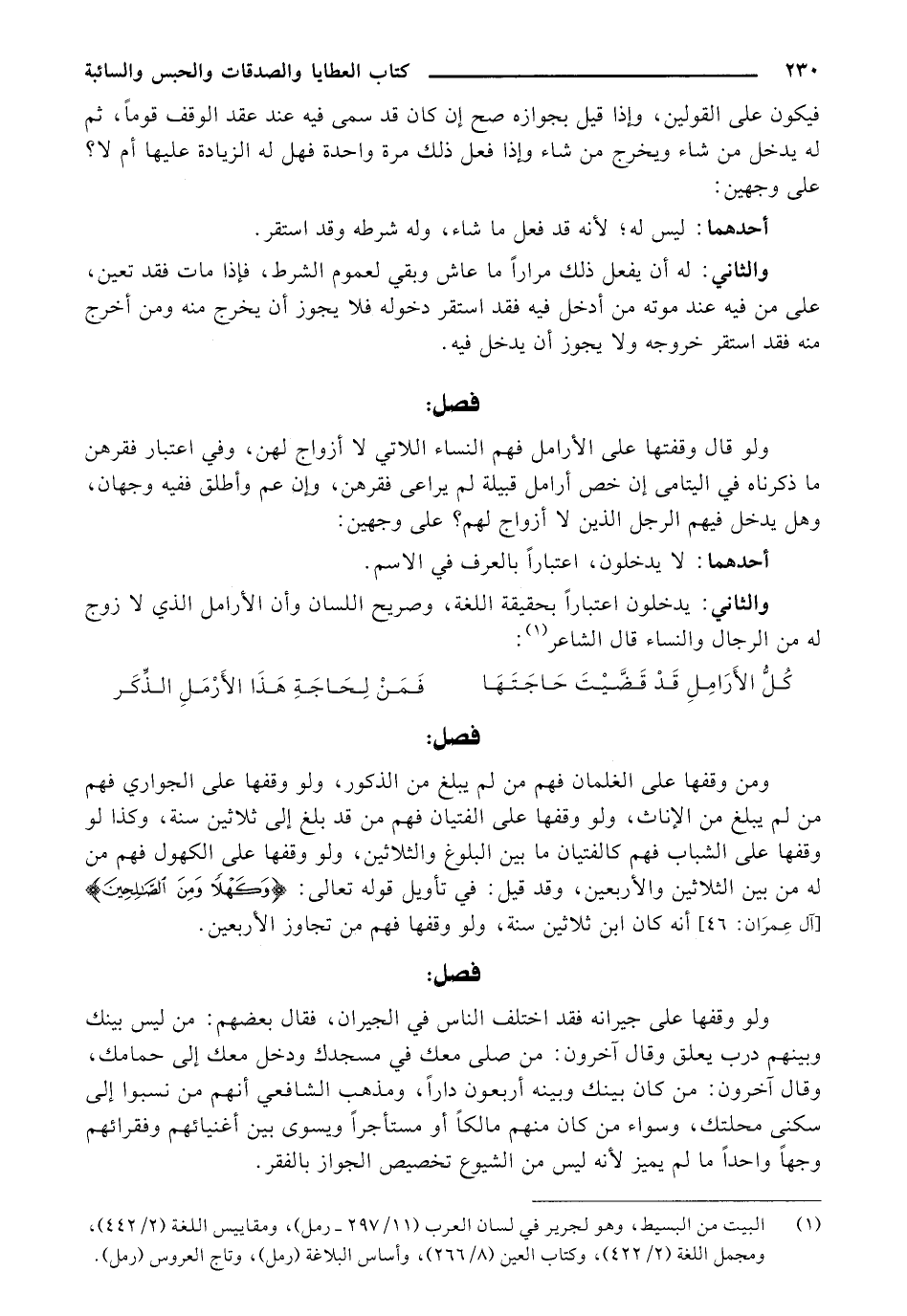 ولو قال وقفتها على الأرامل فهم النساء اللاتي لا أزواج لهن, وفي اعتبار فقرهن ما ذكرناه في اليتامى إن خص أرامل قبيلة لم يراعى فقرهن، وان عم وأطلق ففيه وجهان، وهل يدخل فيهم الرجل الذين لا أزواج لهم؟ على وجهين: