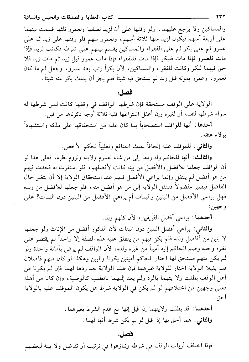 والمساكين ولا يرجع عليهما، ولو وقفها على أن لزيد نصفها ولعمرو ثلثها قسمت بينهما على أربعة أسهم فيكون لزيد منها ثلاثة أسهم، ولعمرو سهم فلو وقفها على زيد ثم على عمرو ثم على بكر ثم على الفقراء والمساكين يقسم بينهم على شرطه فكانت لزيد فإذا مات فلعمرو فإذا مات فلبكر فإذا مات فللفقراء فإذا مات عمرو قبل زيد ثم مات زيد فلا حق فيهما لبكر وكانت للفقراء والمساكينء لأن بكرًا رتب بعد عمرو، وجعل لم ما كان لعمرو، وعمرو بموته قبل زيد لم يستحق فيه شيئًا فلم يجز أن يملك بكر عنه شيئًا.