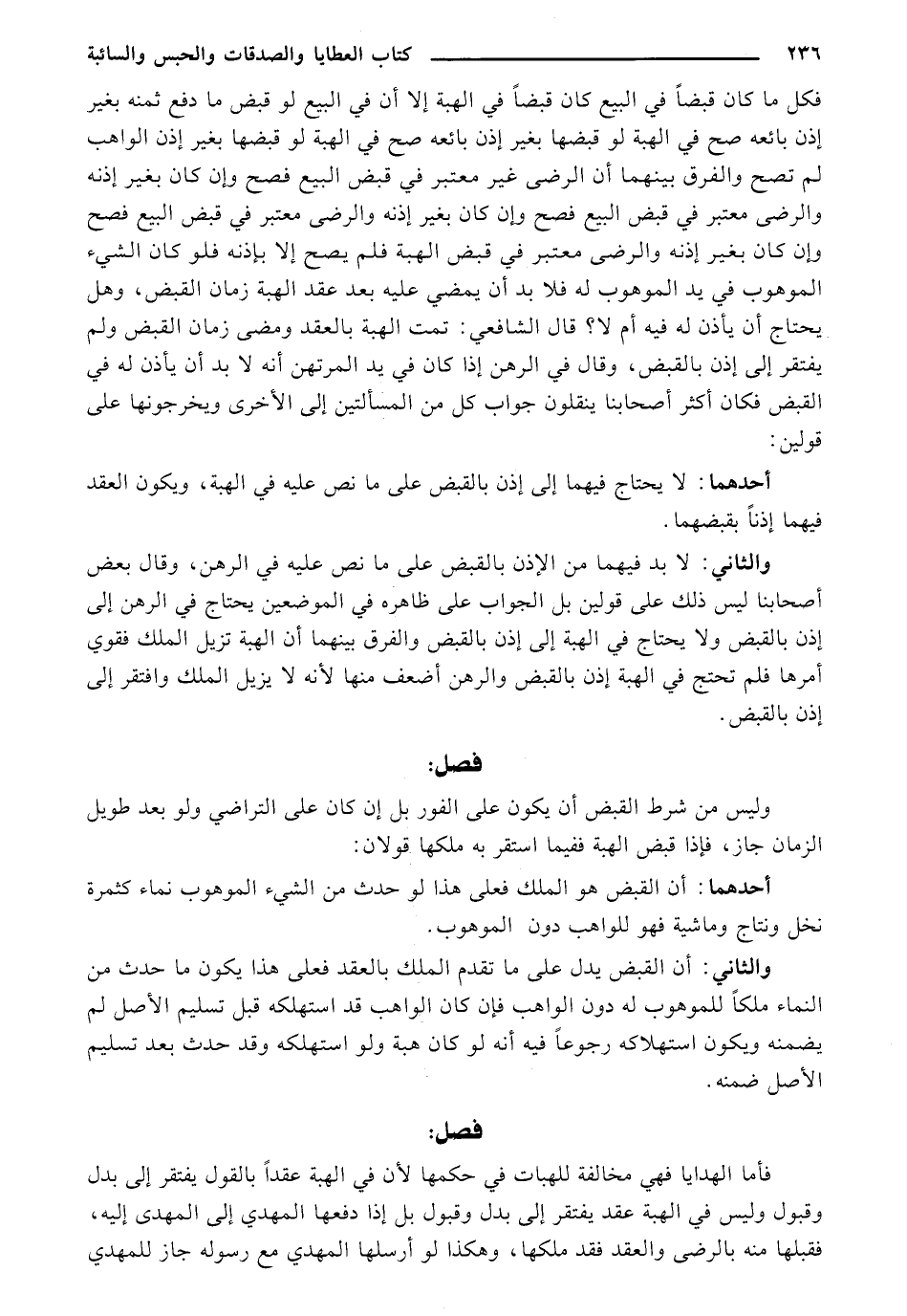 فكل ما كان قبضا في البيع كان قبضًا في الهبة إلا أن في البيع لو قبض ما دفع ثمنه بغير إذن بائعه صح في الهبة لو قبضها بغير إذن بائعه صح في الهبة لو قبضها بغير إذن الواهب لم تصح والفرق بينهما أن الرضي غير معتبر في قبض البيع فصح وان كان بغير إذنه والرضي معتبر في قبض البيع فصح وان كان بغير إذنه والرضي معتبر في قبض البيع فصح وان كان بغير إذنه والرضى معتبر في قبض الهبة فلم يصح إلا بإذنه فلو كان الشيء الموهوب في يد الموهوب له فلابد أن يمضي عليه بعد عقد الهبة زمان القبض، وهل يحتاج أن يأذن له فيه أم لا؟ قال الشافعي: تمت الهبة بالعقد ومضى زمان القبض ولم يفتقر إلى إذن بالقبض، وقال في الرهن إذا كان في يد المرتهن أنه لابد أن يأذن له في القبض فكان أكثر أصحابنا ينقلون جواب كل من المسألتين إلى الأخرى ويخرجونها محلى قولين: