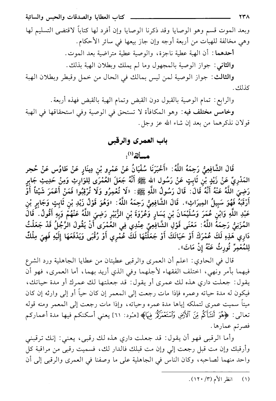 قال الشافعي رحمه الله: "أخبرنا سفيان عن عمرو بن دينار عن طاوس عن حجر المدري عن زيد بن ثابت عن رسول الله صلى الله عليه وسلم أنه جعل العمرى للوارث ومن حديث جابر رضي الله عنه أنه قال: قال رسول الله صلى الله عليه وسلم: "لا تعمرو ولا ترقبوا فمن أعمر شيئًا أو أرقبه فهو سبيل الميراث".قال الشافعي رحمه الله: "وهو قول زيد بن ثابت وجابر بن عبد الله وابن عمر وسليمان بن يسار وعروة بن الزبير رضي الله عنهم وبه أقول. قال المزني رحمه الله: معنى قول الشافعي عندي في العمرى أن يقول الرجل قد جعلت داري هذه لك عمرك أو حياتك أو جعلتها لك عمري أو رقبى ويدفعها إليه فهي ملك للمعمر تورث عنه إن مات".