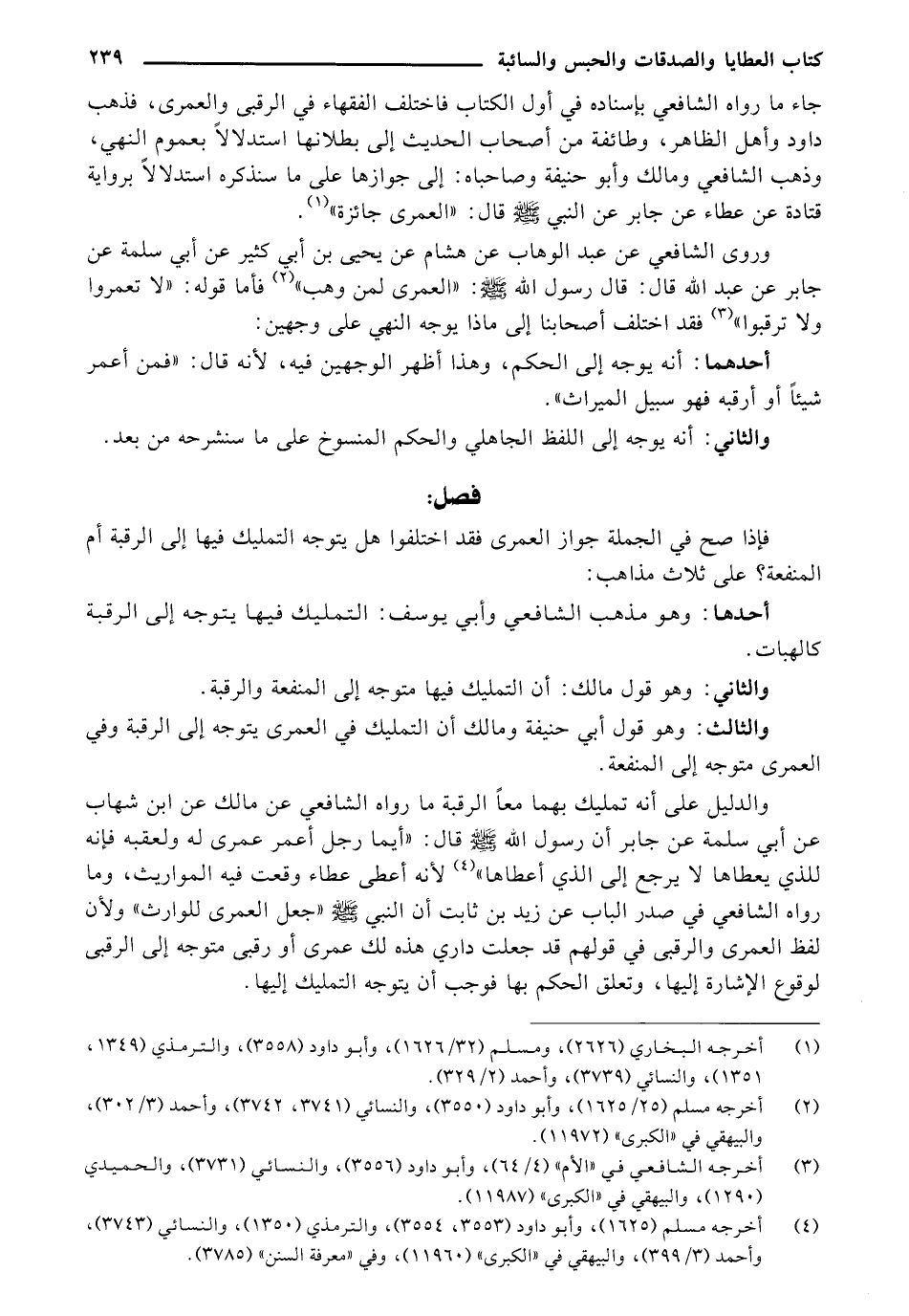 جاء ما رواه الشافعي بإسناده في أول الكتاب فاختلف الفقهاء في الرقبى والعمرى، فذهبه داود وأهل الظاهر، وطائفة من أصحاب الحديث إلى بطلانها استدلالًا بعموم النهي، وذهب الشافعي ومالك وأبو حنيفة وصاحباه: إلى جوازها على ما سنذكره استدلالًا برواية قتادة عن عطا، عن جابر عن النبي صلى الله عليه وسلم قال: "العمرى جائزة ".