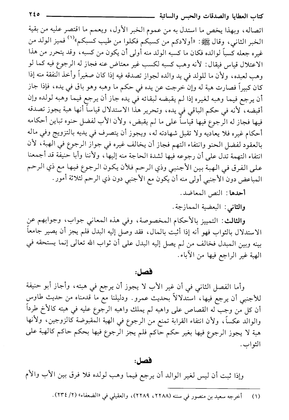 وأما الفصل الثاني في أن الأب لا يجوز أن يرجع في هبته، وأجاز أبو حنيفة للأجنبي أن يرجع فيها، استدلالاُ بحديث عمرو. ودليلنا مع ما قدمناه من حديث طاووس أن كل من وجب له القصاص على واهبه لم يملك واهبه الرجوع عليه في هبته كالأخ طرداً والوالد عكساً، ولأن انتفاء القرابة تمنع من الرجوع في الهبة المقبوضة كالزوجين، ولأنها هبة لا يجوز فيها بغير حكم حاكم فلم يجز الرجوع فيها بحكم حاكم كالهبة على الثواب.