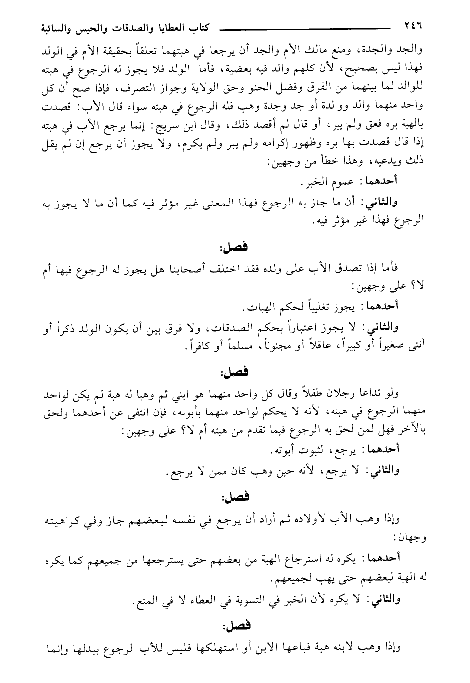 والجد والجدة، ومنع مالك الأم والجد أن يرجعا في هبتهما تعلقا بحقيقة الأم في الولد فهذا ليس بصحيح، لأن كل منهم والد فيه بعضيه، فأما فأما الولد فلا يجوز له الرجوع في هبته للوالد لما بينهما من الفرق وفضل الحنو وحق الولاية وجواز التصرف، فإذا صح أن كل واحد منهما والد ووالده أو ووالدة أو جد وجدة وهب فله الرجوع في هبته سواء قال الأب: قصدت بالهبة برة فعتق ولم يبر، أو قال لم أقصد ذلك، وقال ابن سريج: إنما يرجع الأب في هبته إذا قال قصدت بها بره وظهور إكرامه ولم يبر ولم يكرم، ولا يجوز أن يرجع إن لم يقل ذلك ويدعيه، وهذا خطأ من وجهين: