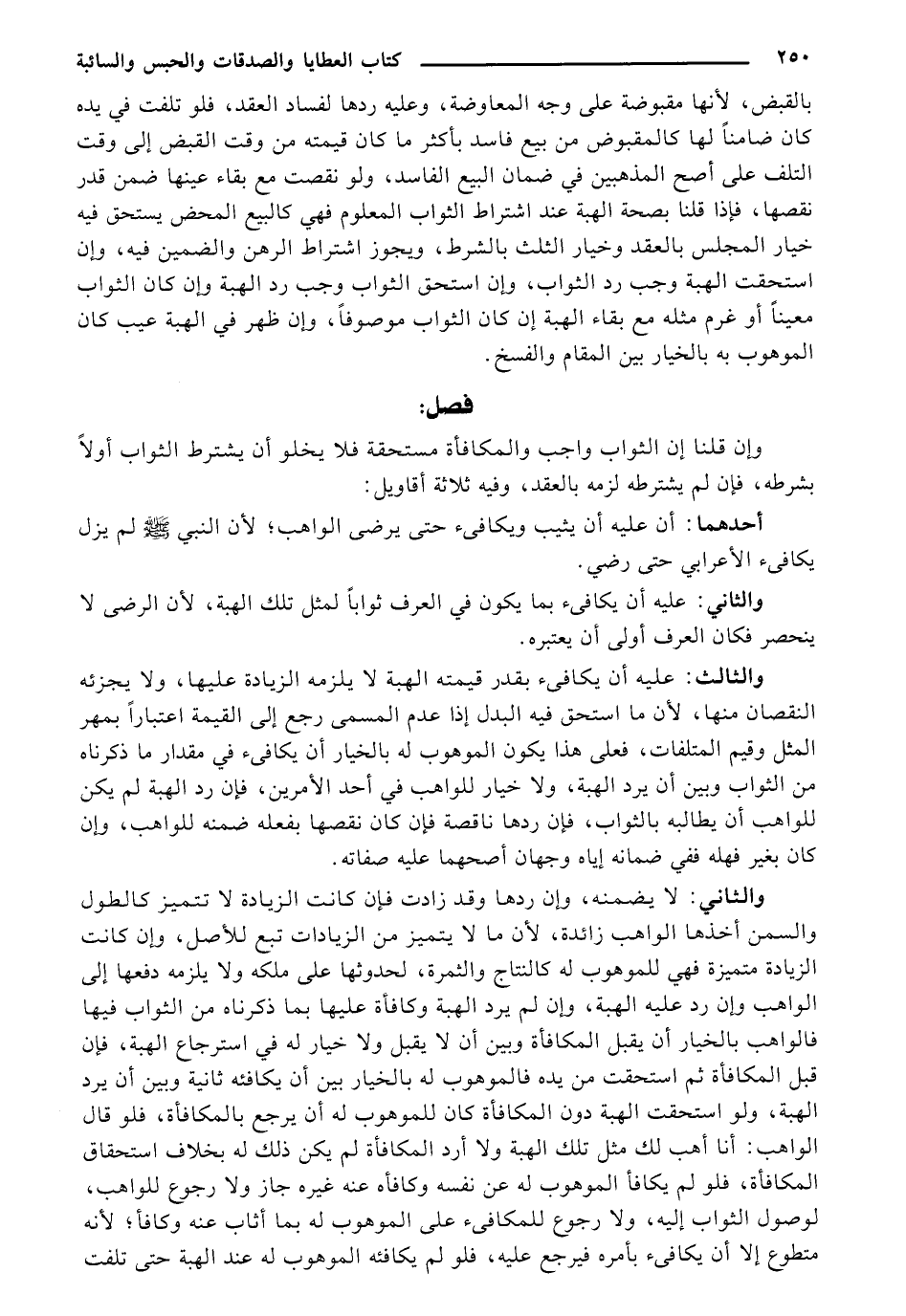 وإن قلنا إن الثواب واجب والمكافأة مستحقة فلا يخلو أن يشترط الثواب أولا بشرطه، فإن لم يشترطه لزمه بالعقد، وفيه ثلاث أقاويل: