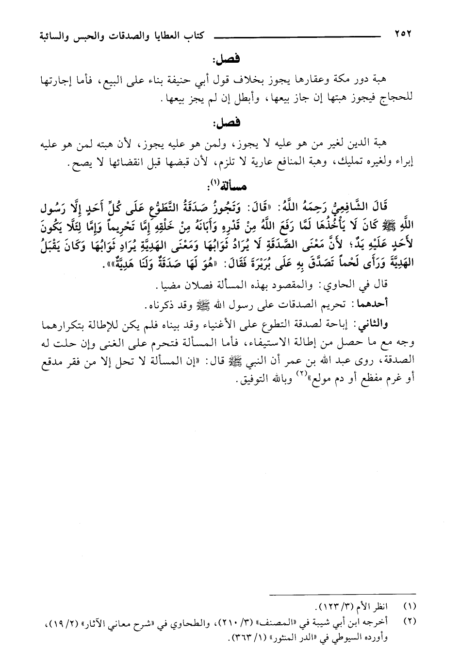 قَالَ الشَّافِعِيُّ رَحِمَهُ اللَّهُ: "قَالَ: وَتَجُوزُ صَدَقَةُ التَّطَوُّعِ عَلَى كُلِّ أَحَدٍ إِلَّا رَسُول اللَّهِ صَلَّى اللَّهُ عَلَيْهِ وَسَلَّم كَانَ لَا يَاخُذُهَا لَمَّا رَفَعَ اللَّهُ مِنْ قَدْرِهِ وَأَبَانَهُ مِنْ خَلْقِهِ إِمَّا تَحْرِيمًا وَإِمَّا لِئَلَّا يَكُونَ لِأَحَدٍ عَلَيْهِ يَدْ؛ لأَنَّ مَعْنَى الصَّدقَةَ لَا يُرَادُ ثَوَابُهَا وَمَعْنَى الهَدِيَّةِ يُرَادِ ثَوَابُهَا وَكَانَ يَقْبَلُ الهَدِيَّةَ وَرَأَى لحَمْاً تَصَدَّقَ بِهِ عَلَى بُرَيْرَةَ فَقَالَ: "هُوَ لَهَا صَدَقَةٌ وَلَنَا هَدِيَّةٌ"".
