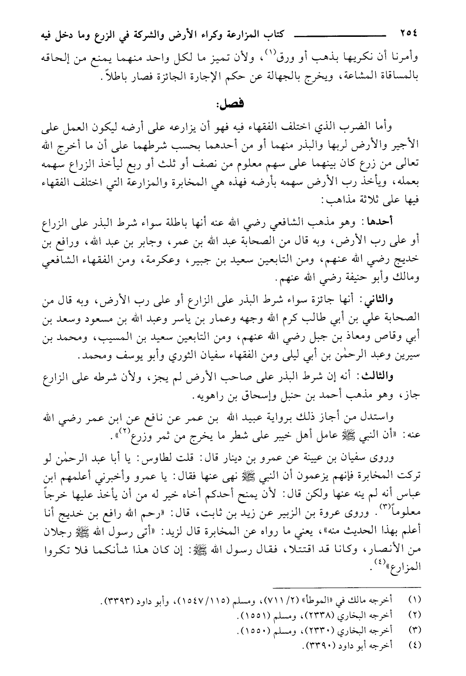 وروى سفيان بن عيينة عن عمرو بن دينار قال: قلت لطاوس: يا أبا عبد الرحمن لو تركت المخابرة فإنهم يزعمون أن النبي صَلَّى اللَّهُ عَلَيْهِ وَسَلَّم نهى عنها فقال: يا عمرو وأخبرني أعلمهم ابن عباس أنه لم ينه عنها ولكن قال: لأن يمنح أحدكم أخاه خير له من أن يأخذ عليها خرجًا معلومًا. وروى عروة بن الزبير عن زيد بن ثابت، قال: "رحم الله رافع بن خديج أنا أعلم بهذا الحديث منه"، يعني ما رواه عن المخابرة قال لزيد: " أتى رسول لله صَلَّى اللَّهُ عَلَيْهِ وَسَلَّم رجلان من الأنصار، وكان قد اقتتلا، فقال رسول الله صَلَّى اللَّهُ عَلَيْهِ وَسَلَّم: إن كان هذا شأنكما فلا تكروا المزارع".