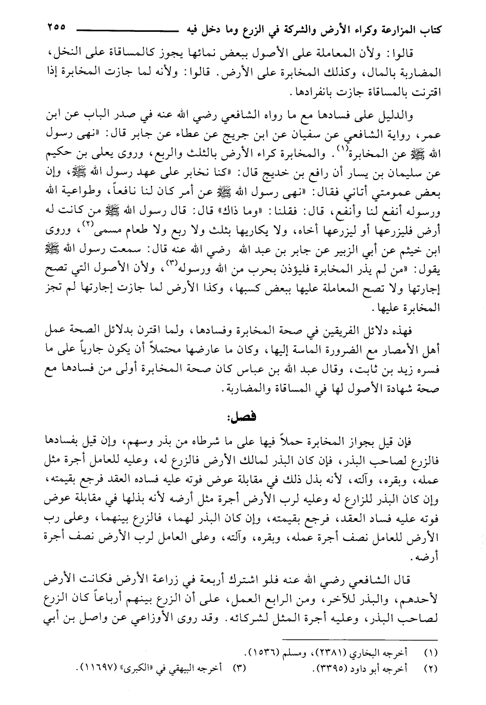 والدليل على فسادها مع ما رواه الشافعي رضي الله عنه في صدر الباب عن ابن عمر، رواية الشافعي عن سفيان عن ابن جريج عن عطاء عن جابر قال: "نهى رسول الله صَلَّى اللَّهُ عَلَيْهِ وَسَلَّم عن المخابرة. والمخابرة كراء الأرض بالثلث والربع، وروى يعلى بن حكيم عن سليمان بن يسار أن رافع بن خديج قال: "كنا نخابر على عهد رسول الله صَلَّى اللَّهُ عَلَيْهِ وَسَلَّم، وإن بعض عمومتي أتاني فقال: "نهى رسول الله صَلَّى اللَّهُ عَلَيْهِ وَسَلَّم عن أمر كان لنا نافعًا، وطواعية الله ورسوله أنفع لنا وأنفع، قال: فقلنا: "وما ذاك" قال: قال رسول الله صَلَّى اللَّهُ عَلَيْهِ وَسَلَّم من كانت له أرض فليزرعها أو ليزرعها أخاه، ولا يكاريها بثلث ولا ربع ولا طعام مسمى، وروى ابن خيثم عن أبي الزبير بن جابر بن عبد الله رضي الله عنه قال: سمعت رسول الله صَلَّى اللَّهُ عَلَيْهِ وَسَلَّم يقول: "من لم يذر المخابرة فليؤذن بحرب من الله ورسوله، ولأن الأصول التي تصح إجارتها ولا تصح المعاملة عليها ببعض كسبها, وكذا الأرض لما جازت إجارتها لم تجز المخابرة عليها.