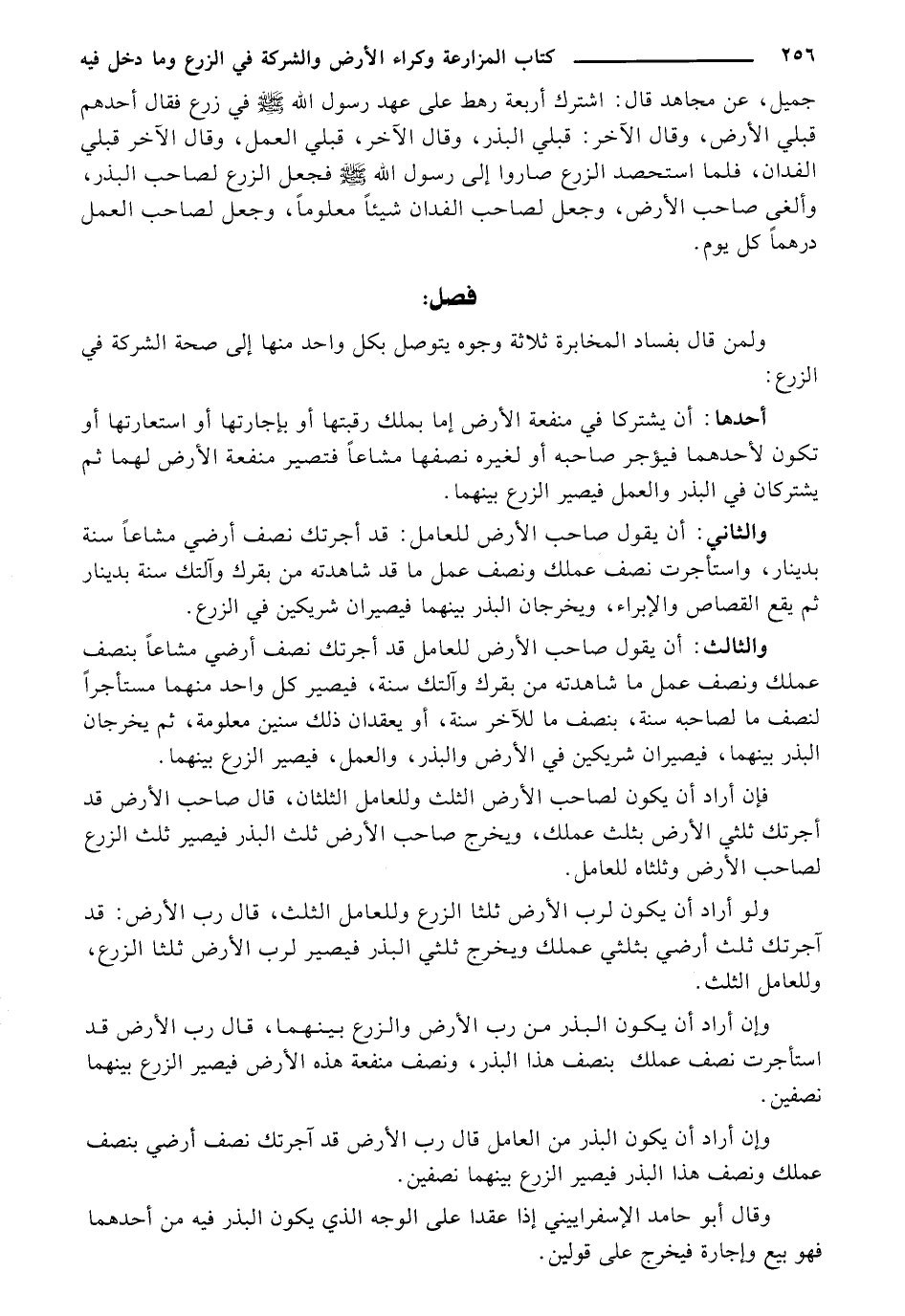 والثالث: أن يقول صاحب الأرض للعامل قد أجرتك نصف أرضي مشاعًا بنصف عملك ونصف عمل ما شاهدته من بقرك وآلتك سنة، فيصير كل واحد منهما مستأجرًا لنصف ما لصاحبه سنة، بنصف ما للآخر سنة، أو يعقدان ذلك سنين معلومة، ثم يخرجان البذر بينهما، فيصيران شريكين في الأرض والبذر، والعمل، فيصير الزرع بينهما.