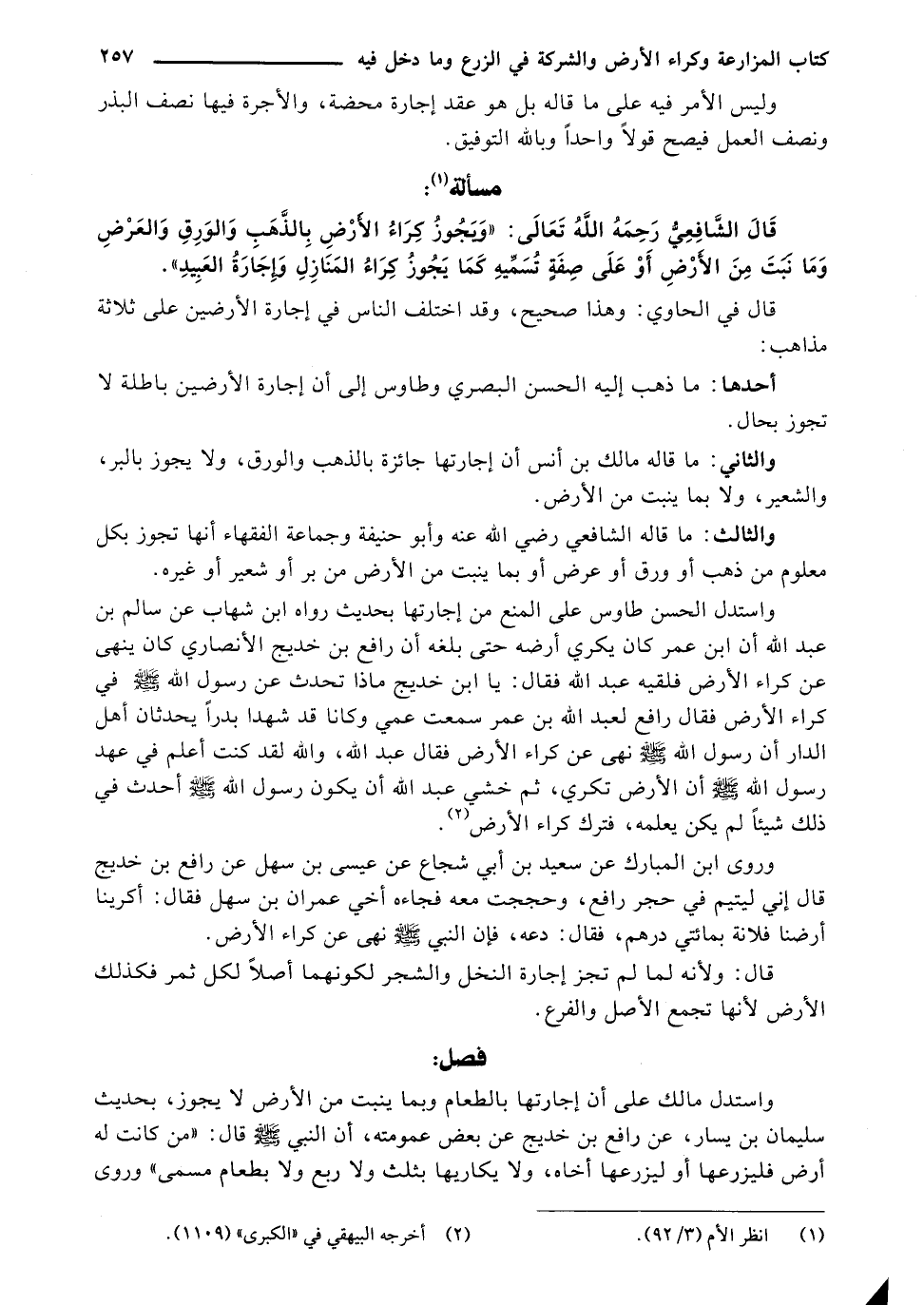 قَالَ الشَّافِعِيُّ رَحِمَهُ اللَّهُ تَعَالَى: "وَيَجُوزُ كِرَاءُ الأَرْضِ بِالذَّهَبِ وَالوَرَقِ وَالعَرْضِ وَمَا نَبَتَ مِنَ الأَرْضِ أَوْ عَلَى صِفَةٍ تُسَمِّيهِ كَمَا يَجُوزُ كِرَاءُ المَنَازِلِ وَإِجَارَةُ العَبِيدِ".