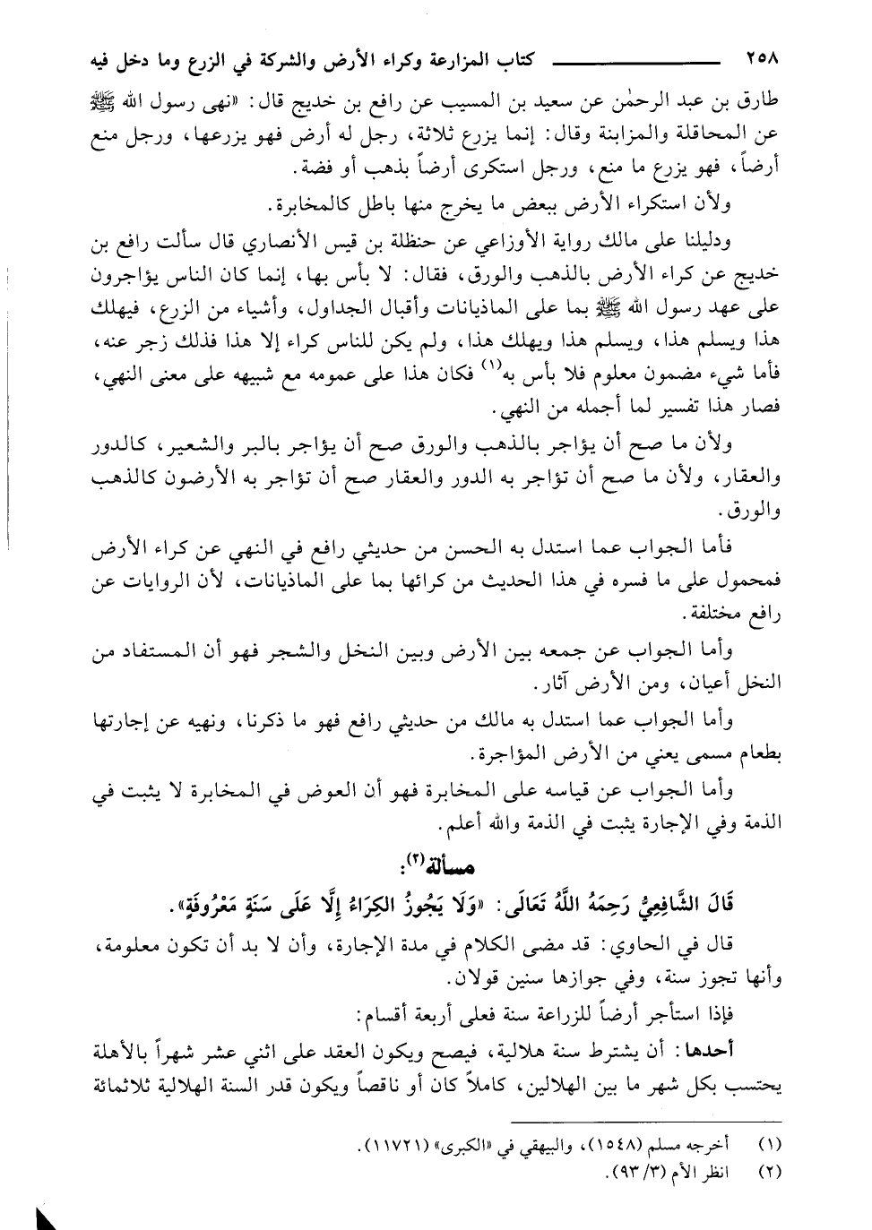 وأما الجواب عما استدل به مالك من حديثي رافع فهو ما ذكرنا، ونهيه عن إجارتها بطعام مسمى يعني من الأرض المؤاجرة.