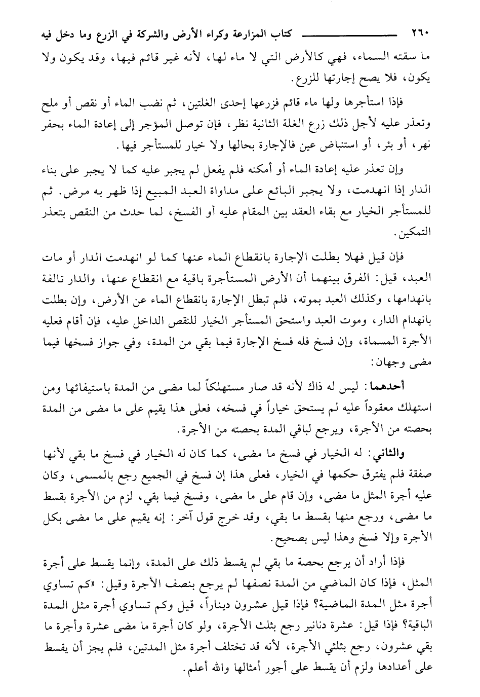 فإن قيل فهلا بطلت الإجارة بانقطاع الماء عنها كما لو انهدمت الدار أو مات العبد، قيل: الفرق بينهما أن الأرض المستأجرة باقية مع انقطاع عنها، والدار تالفة بانهدامها، وكذلك العبد بموته، فلم تبطل الإجارة بانقطاع الماء عن الأرض، وإن بطلت بانهدام الدار، وموت العبد واستحق المستأجر الخيار للنقص الداخل عليه، فإن أقام فعليه الأجرة المسماة، وإن فسخ فله فسخ الإجارة فيما بقي من المدة، وفي جواز فسخها فيما مضى وجهان: