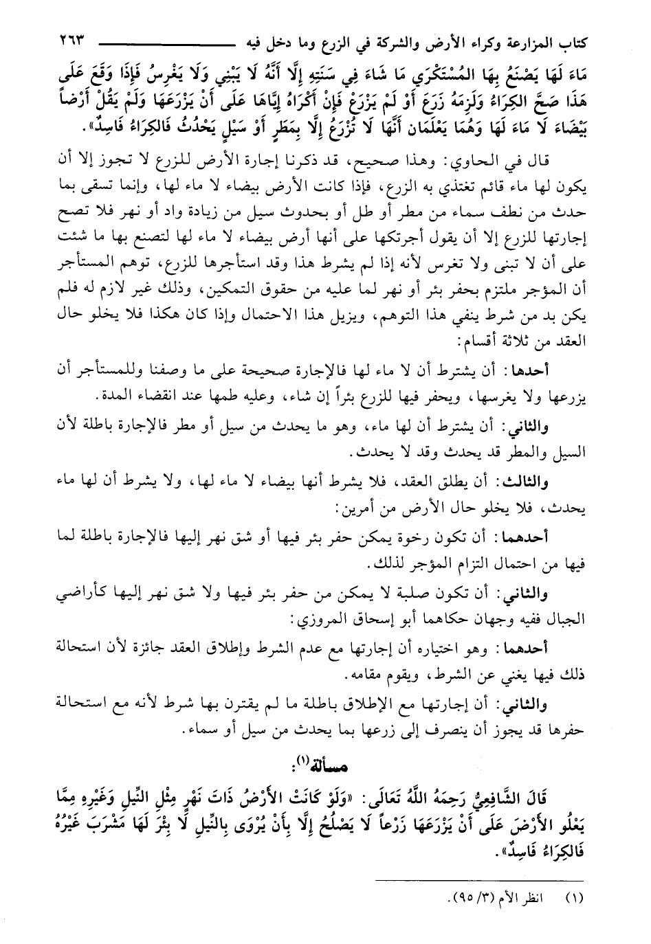 قَالَ الشَّافِعِيُّ رَحِمَهُ اللَّهُ تَعَالَى: "وَلَوْ كَانَتِ الْأَرْضُ ذَاتَ نَهْرٍ مِثْلِ النِّيلِ وَغَيْرِهِ مِمَّا يَعْلُو الْأَرْضَ عَلَى أَنْ يَزْرَعَهَا زَرْعًا لَا يَصْلُحُ إِلَّا بِأَنْ يُرْوَى بِالنِّيلِ لَا بِئْرَ لَهَا مَشْرَبَ غَيْرُهُ فَالْكِرَاءُ فَاسِدٌ".