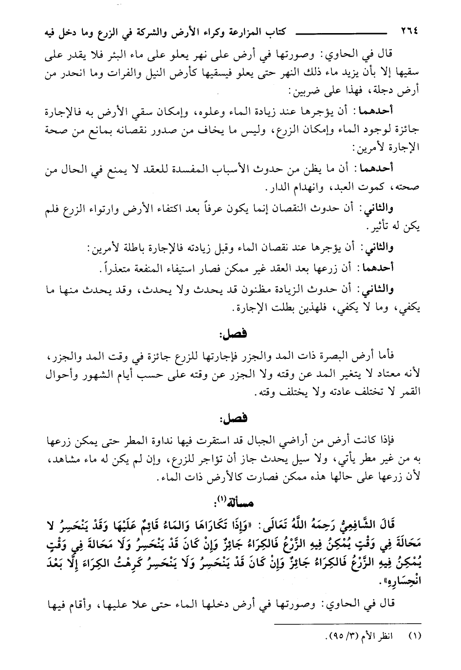 قَالَ الشَّافِعِيُّ رَحِمَهُ اللَّهُ تَعَالَى: "وَإِذَا تَكَارَاهَا وَالْمَاءُ قَائِمٌ عَلَيْهَا وَقَدْ يَنْحَسِرُ لَا مَحَالَةَ فِي وَقْتٍ يُمْكِنُ فِيهِ الزَّرْعُ فَالْكِرَاءُ جَائِزٌ وَإِنْ كَانَ قَدْ يَنْحَسِرُ لَا مَحَالَةَ فِي وَقْتٍ يُمْكِنُ فِيهِ الزَّرْعُ فَالْكِرَاءُ جَائِزٌ وَإِنْ كَانَ قَدْ يَنْحَسِرُ وَلَا يَنْحَسِرُ كَرِهْتُ الْكِرَاءَ إِلَّا بَعْدَ انْحِسَارِه".