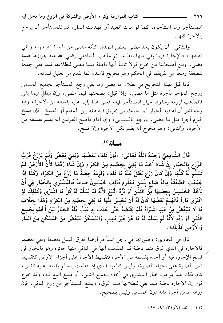 قَالَ الشَّافِعِيُّ رَحِمَهُ اللَّهُ تَعَالَى: "فَإِنْ تَلِفَ بَعْضُهَا وَبَقِيَ بَعْضٌ وَلَمْ يَزْرَعْ فَرَبُّ الزِّرْعِ بِالْخِيَارِ إِنْ شَاءَ أَخَذَ مَا بَقِيَ بِحِصَّتِهِ مِنَ الْكِرَاءِ وَإِنْ شَاءَ رَدَّهَا لِأَنَّ الْأَرْضَ لَمْ تُسَلَّمْ لَهُ كُلُّهَا وَإِنْ كَانَ زَرَعَ بَطُلَ عَنْهُ مَا تَلِفَ وَلَزِمَهُ حِصَّةُ مَا زَرَعَ مِنَ الْكِرَاءِ وَكَذَا إِذَا جَمَعَتِ الصَّفْقَةُ مِائَةَ صَاعٍ بِثَمَنٍ مَعْلُومٍ فَتَلِفَ خَمْسُونَ صَاعًا فَالْمُشْتَرِي بِالْخِيَارِ فِي أَنْ يَاخُذَ الْخَمْسِينَ بِحِصَّتِهَا مِنَ الثَّمَنِ أَوْ يَرُدَّ الْبَيْعَ لِأَنَّهُ لَمْ يُسَلِّمْ لَهُ كُلَّ مَا اشْتَرَى وَكَذَلِكَ لَوِ اكْتَرَى دَارًا فَانْهَدَمَ بَعْضُهَا كَانَ لَهُ أَنْ يَحْبِسَ مِنْهَا مَا بَقِيَ بِحِصَّتِهِ مِنَ الْكِرَاءِ وَهَذَا بِخِلَافِ مَا لَا يَتَبَعَّضُ مِنْ عَبْدٍ اشْتَرَاهُ فَلَمْ يَقْبِضْهُ حَتَّى حَدَثَ بِهِ عَيْبٌ فَلَهُ الْخِيَارُ بَيْنَ أَخْذِهِ بِجَمِيعِ الثَّمَنِ أَوْ رَدِّهِ لِأَنَّهُ لَمْ يَسْلَمْ لَهُ مَا هُوَ غَيْرُ مَعِيبٍ وَالْمَسْكَنُ يَتَبَعَّضُ مِنَ الْمَسْكَنِ مِنَ الدَّارِ وَالْأَرْضِ كَذَلِك".