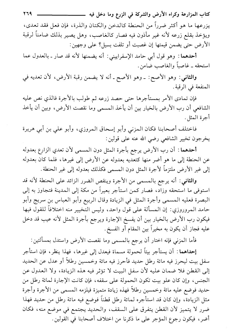 والثاني: أنه يرجع بالمسمى من الأجرة وينقص الضرر الزائد على الحنطة: لأنه قد استوفى ما استحقه وزاد، فصار كمن استأجر بعيرًا من مكة إلى المدينة فتجاوز به إلى البصرة فعليه المسمى وأجرة المثل في الزيادة وقال الربيع وأبو العباس بن سريج وأبو حامد المروروزي: إن المسألة على قول واحد، وليس التخيير منه اختلافًا للقول فيها فيكون رب الأرض بالخيار بين أن يفسخ الإجارة ويرجع بأجرة المثل: لأنه عيب قد دخل عليه فجاز أن يكون به مخيرًا بين المقام أو الفسخ.