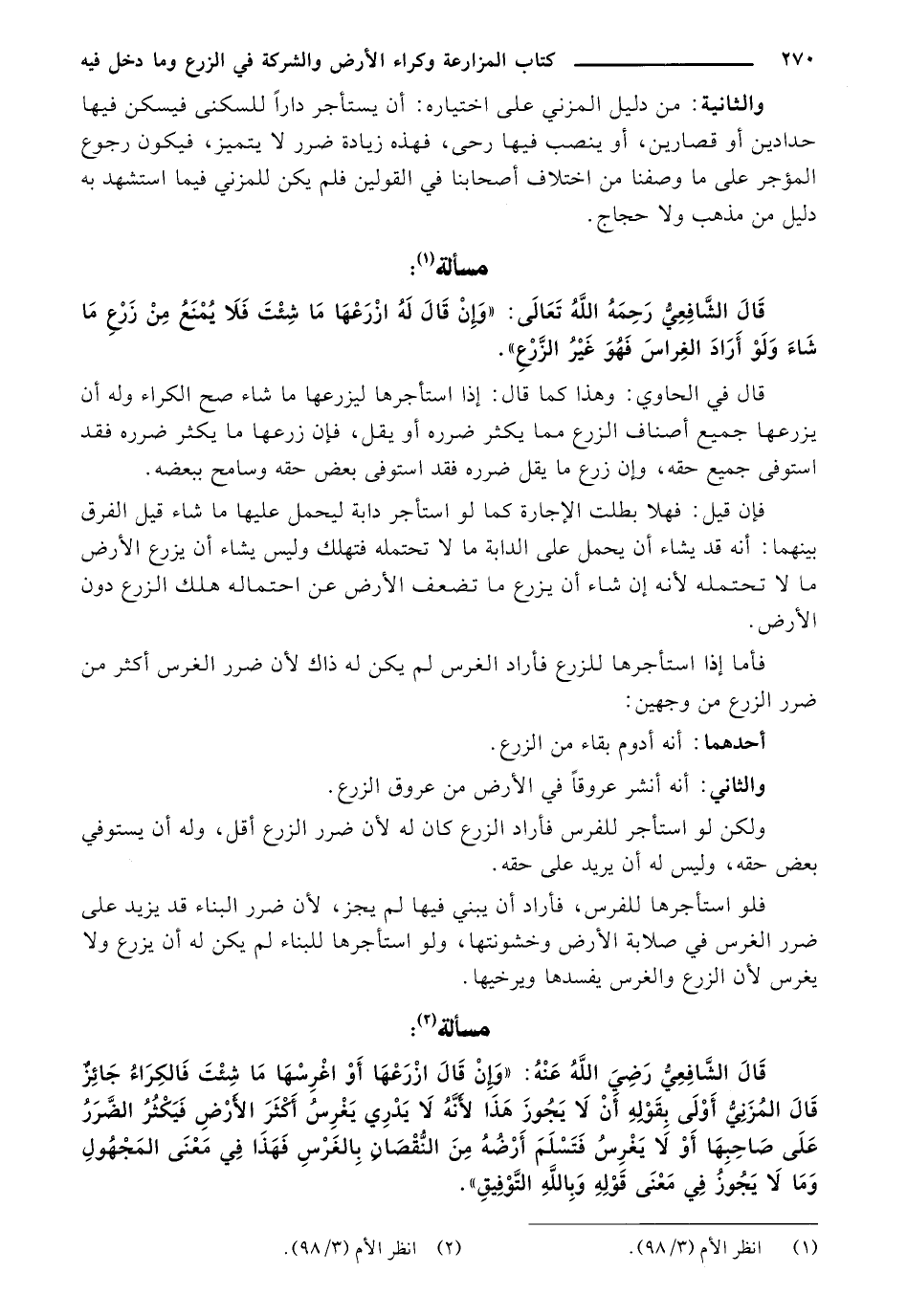 قَالَ الشَّافِعِيُّ رَضِيَ اللَّهُ عَنْهُ: "وَإِنْ قَالَ ازْرَعْهَا مَا شِئْتَ فَالْكِرَاءُ جَائِزٌ قَالَ الْمُزَنِيّ أَوْلَى بِقَوْلِهِ أَنْ لَا يَجُوزَ هَذَا لِأَنَّهُ لَا يَدْرِي يَغْرِسُ أَكْثَرَ الْأَرْضِ فَيَكْثُرُ الضَّرَرُ عَلَى صَاحِبِهَا أَوْ لَا يَغْرِسُ فَتَسْلَمُ أَرْضُهُ مِنْ النُّقْصَانِ بِالْغَرْسِ فَهَذَا فِي مَعْنَى الْمَجْهُولِ وَمَا لَا يَجُوزُ فِي مَعْنَى قَوْلِهِ وَبِاَللَّهِ التَّوْفِيقِ".