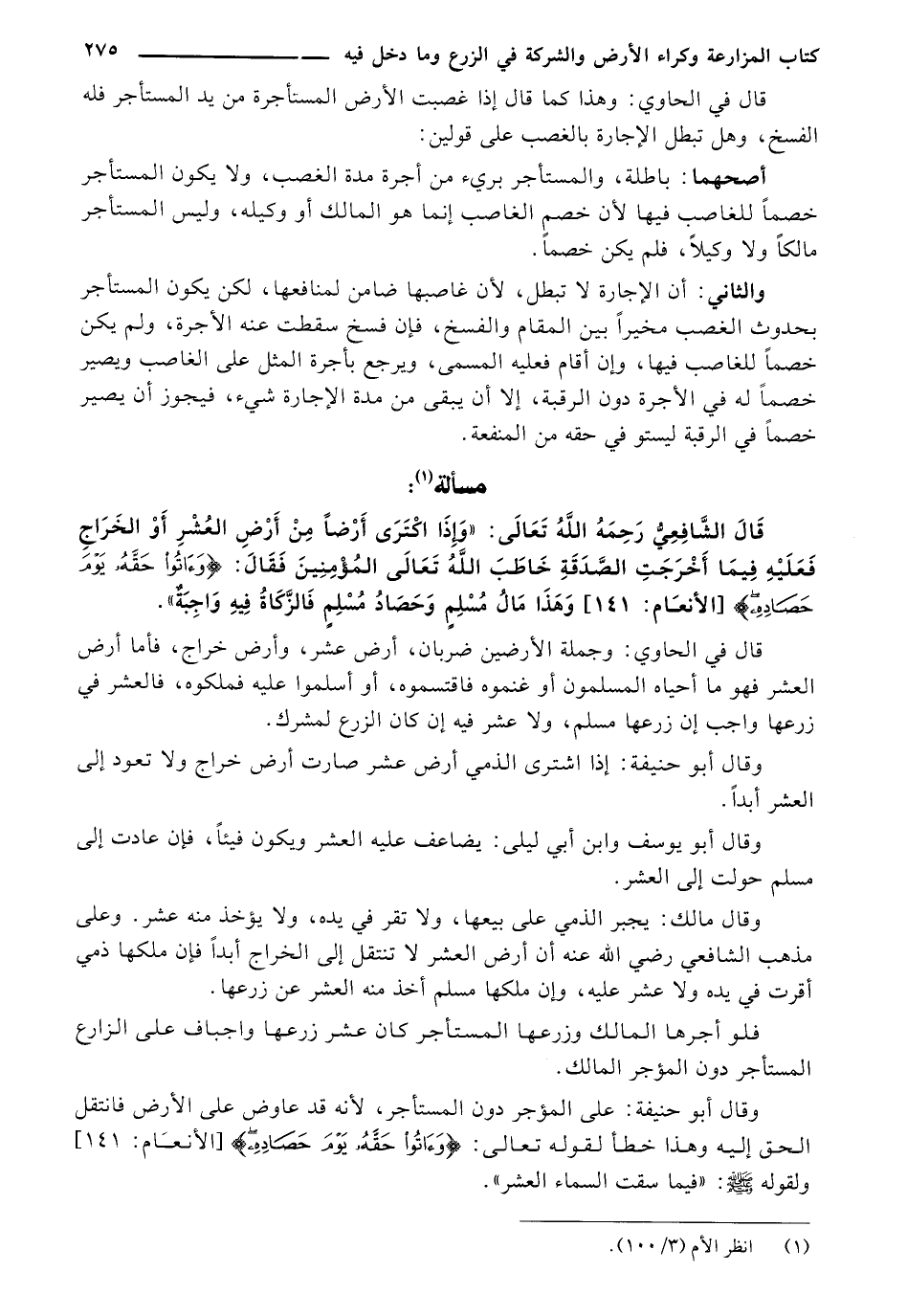 قَالَ الشَّافِعِيُّ رَحِمَهُ اللَّهُ تَعَالَى: "وَإِذَا اكْتَرَى أَرْضًا مِنْ أَرْضِ الْعُشْرِ أَوِ الْخَرَاجِ فَعَلَيْهِ فِيمَا أُخْرِجَتِ الصَّدَقَةُ خَاطَبَ اللَّهُ تَعَالَى الْمُؤْمِنِينَ فَقَالَ: {وَآَتُوا حَقَّهُ يَوْمَ حَصَادِهِ} [الأنعام: 141] وَهَذَا مَالُ مُسْلِمٍ وَحَصَادُ مُسْلِمٍ فَالزَّكَاةُ فِيهِ وَاجِبَةٌ".