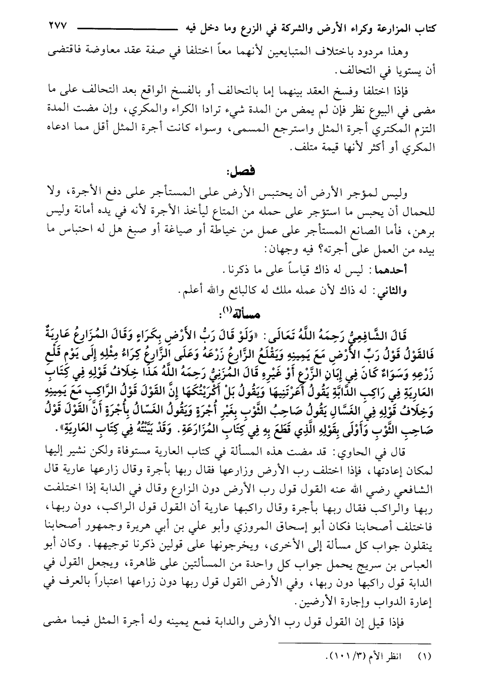 قَالَ الشَّافِعِيُّ رَحِمَهُ اللَّهُ تَعَالَى:"وَلَوْ قَالَ رَبُّ الْأَرْضِ بِكِرَاءٍ وَقَالَ الْمُزَارِعُ عَارِيَةٌ فَالْقَوْلُ قَوْلُ رَبِّ الْأَرْضِ مَعَ يَمِينِهِ وَيَقْلَعُ الزَّارِعُ زَرْعَهُ وَعَلَى الزَّارِعِ كِرَاءُ مِثْلِهِ إِلَى يَوْمِ قَلْعِ زَرْعِهِ وَسَوَاءٌ كَانَ فِي إِبَانِ الزَّرْعِ أَوْ غَيْرِهِ قَالَ الْمُزَنِيّ رَحِمَهُ اللَّهُ هَذَا خِلَافُ قَوْلِهِ فِي كِتَابِ الْعَارِيَةِ فِي رَاكِبِ الدَّابَّةِ يَقُولُ أَعَرْتَنِيهَا وَيَقُولُ بَلْ أَكْرَيْتُكَهَا إِنَّ الْقَوْلَ قَوْلُ الرَّاكِبِ مَعَ يَمِينِهِ وَخِلَافُ قَوْلِهِ فِي الْغَسَّالِ يَقُولُ صَاحِبُ الثَّوْبِ بِغَيْرِ أُجْرَةٍ وَيَقُولُ الْغَّسَالُ بِأُجْرَةٍ أَنَّ الْقَوْلَ قَوْلُ صَاحِبِ الثَّوْبِ وَأَوْلَى بِقَوْلِهِ الَّذِي قَطَعَ بِهِ فِي كِتَابِ الْمُزَارَعَةِ. وَقَدْ بَيَّنْتُهُ فِي كِتَابِ الْعَارِيَةِ".
