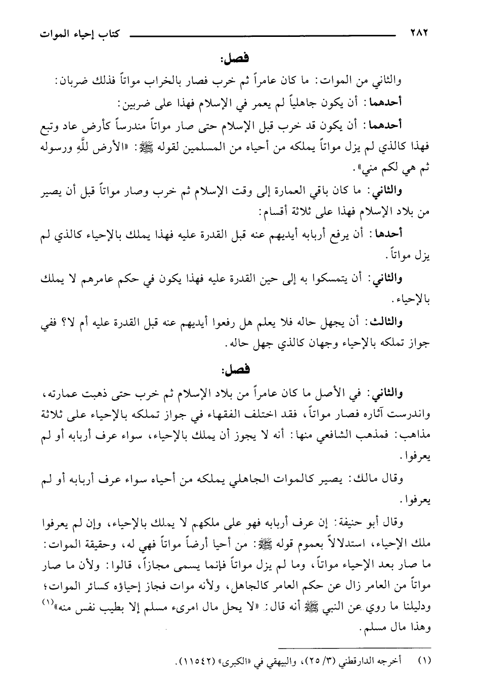 والثاني: في الأصل ما كان عامرًا من بلاد الإسلام ثم خرب حتى ذهبت عمارته، واندرست آثاره فصار مواتًا، فقد اختلف الفقهاء في جواز تملكه بالإحياء على ثلاثة مذاهب: فمذهب الشافعي منها: أنه لا يجوز أن يملك بالإحياء، سواء عرف أربابه أو لم يعرفوا.