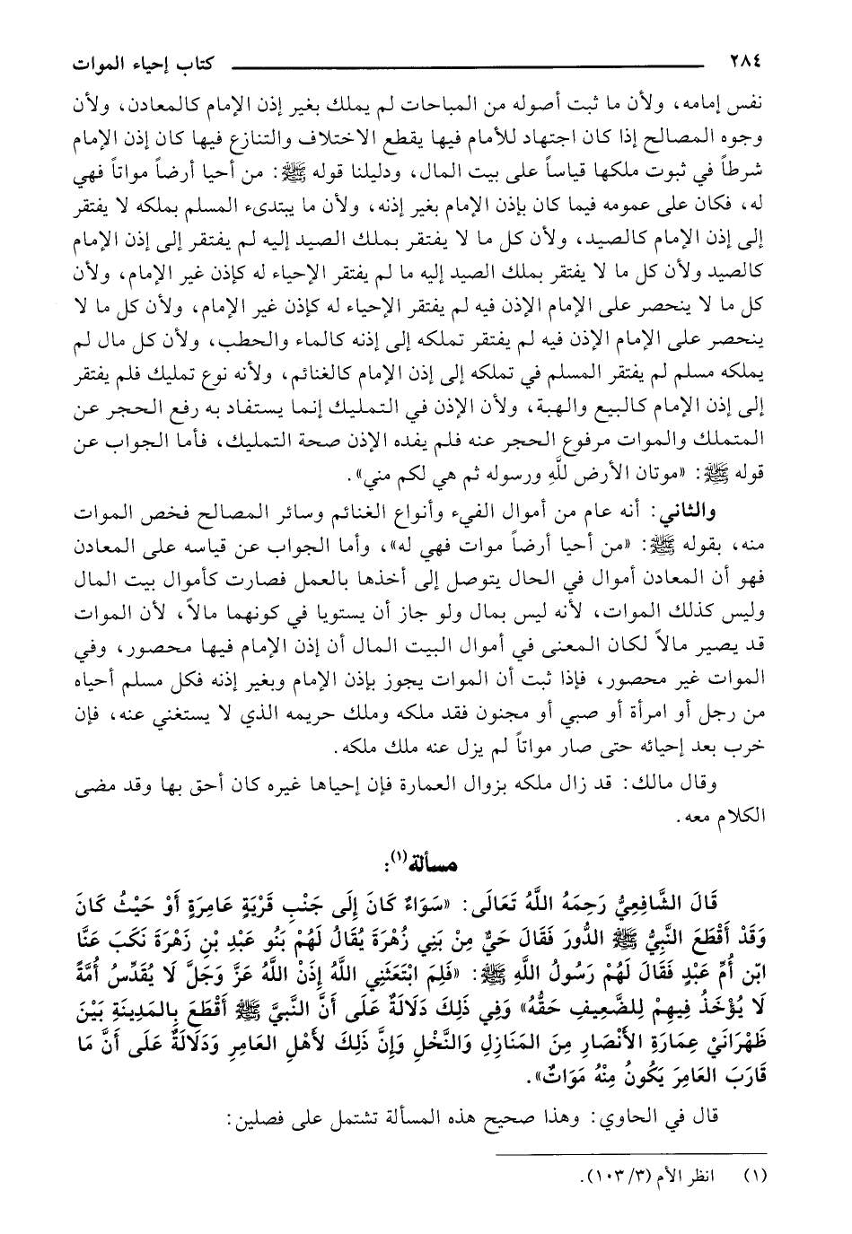 قَالَ الشَّافِعِيُّ رَحِمَهُ اللهُ تَعَالَى: "سَوَاءٌ كَانَ إِلَى جَنْبِ قَرْيَةٍ عَامِرَةٍ أَوْ حَيْثُ كَانَ وَقَدْ أَقْطَعَ النَّبِيُّ صلى الله عليه وسلم الدُّورَ فَقَالَ حَيٌّ مِنْ بَنِي زُهْرَةَ يُقَالُ لَهُمْ بَنُو عَبْدِ بْنِ زَهْرَةَ نَكَبَ عَنَّا ابّن أُمِّ عَبْدٍ فَقَالَ لَهُمْ رَسُولُ اللهِ صلى الله عليه وسلم: "فَلِمَ ابْتَعَثَنِي اللهُ إِذَنْ اللهُ عَزَّ وَجَلَّ لَا يُقَدِّسُ أُمَّةً لَا يُؤْخَذُ فِيهِمْ لِلضَّعِيفِ حَقُّهُ" وَفِي ذَلِكَ دَلَالَةٌ عَلَى أَنَّ النَّبيَّ صلى الله عليه وسلم أَقْطَعَ بِالمَدِينَةِ بَيْنَ ظَهْرَانَيْ عِمَارَةِ الأَنْصَارِ مِنَ المَنَازِلِ وَالنَّخْلِ وَإِنَّ ذَلِكَ لأَهْلِ العَامِرِ وَدَلَالَةٌ عَلَى أَنَّ مَا قَارَبَ العَامِرَ يَكُونُ مِنْهُ مَوَاتٌ".