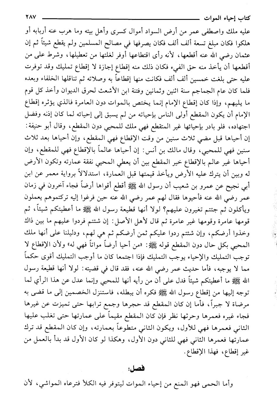 عليه ملك واصطفى عمر من أرض السواد أموال كسرى وأهل بيته وما هرب عنه أربابه أو هلكوا فكان مبلغ تسعة ألف ألف فكان يصرفها في مصالح المسلمين ولم يقطع شيئًا ثم إن عثمان رضي الله عنه أقطعها، لأنه رأى اقتطاعها أو فر لغلتها من تعطيلها، وشرط على من أقطعها أن يأخذ منه حق الفيء فكان ذلك منه إقطاع إجازة لا إقطاع تمليك وقد توفرت عليه حتى بلغت خمسين ألف ألف فكانت منها إقطاعًا به وصلاته ثم تناقلها الخلفاء وبعده فلما كان عام الجماجم سنة اثنين وثمانين وفتنة ابن الأشعث لحرق الديوان وأخذ كل قوم ما يليهم، وإذا كان إقطاع الإمام إنما يختص بالموات دون العامرة فالذي يؤثره إقطاع الإمام ان يكون المقطع أولى الناس بإحياته من لم يسبق إلى إحيائه لما كان إذنه وفضل اجتهاده، فلو بادر بإحيائها غير المتقطع فهي ملك للمحيي دون المقطع، وقال أبو حنيفة: إن أحياها قبل مضي ثلاث سنين من وقت الإقطاع فهي المقطع، وإن أحياها بعد ثلاث سنين فهي للمحيي، وقال مالك بن أنس: إن أحياها عالمًا بالإقطاع فهي للمقطع، وإن أحياها غير عالم بالإقطاع خير المقطع بين أن يعطي المحيي نفقة عمارته وتكون الأرض له وبين أن ينرك عليه الأرض ويأخذ قيمتها قبل العمارة، استدلالًا براوية معمر عن ابن أبي نجيح عن عمرو بن شعيب أن رسول الله صلى الله عليه وسلم أقطع أقواها أرضًا فجاء آخرون في زمان عمر رضي الله عنه حين فرغوا إليه تركتموهم يعملون ويأكلون ثم جئتم تغيرون عليهم؟ لولا أنها قطيعة رسول الله صلى الله عليه وسلم ما أعطيتكم شيئًا، ثم قومها عامرة وقومها غير عامرة ثم قال لأهل الأصل: إن شئتم فردوا عليهم ما بين ذاك وخذوا أرضكم، وإن شئتم ردوا عليكم ثمن أرضكم ثم هي لهم، ودليلنا على أنها ملك المحيي بكل حال دون المقطع قوله صلى الله عليه وسلم: "من أحيا أرضًا مواتًا فهي له" ولأن الإقطاع لا توجب التمليك والإحياء يوجب التمليك فإذا اجتمعا كان ما أوجب التمليك أقوى حكمًا مما لا يوجبه، فأما حديث عمر رضي الله عنه، فقد قال في قضيته: لولا أنها قطيعة رسول الله صلى الله عليه وسلم ما أعطيتكم شيئًا فدل على أن من رأيه أنها للمحيي وإنما عدل عن هذا الرأي لما توجه إليها من إقطاع رسول الله صلى الله عليه وسلم فكره أن يبطلهن فاستنزل الخصمين إلى ما قضى به مرضاة لا جبرًا، فأما إن كان المقطع قد جحرها وجمع ترابها حتى تميزت عن غيرها فجاء غيره فجمعها وحرثها نظر فإن كان المقطع مقيمًا على عمارتها حتى تغلب عليها الثاني فعمرها فهي للأول، ويكون الثاني متطوعًا بعمارته، وإن كان المقطع قد ترك عمارتها فعمرها الثاني فهي للثاني دون الأول، وهكذا لو كان الأول قد بدأ بالعمل من غير إقطاع، فهذا الإقطاع.