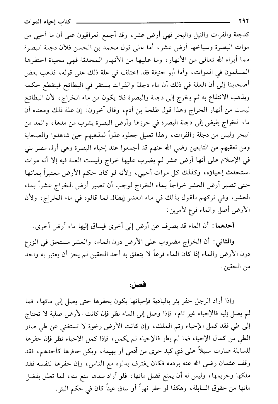 وإذا أراد الرجل حفر بئر بالبادية فإحيائها يكون بحفرها حتى يصل إلى مائها؟ فما لم يصل إليه فالإحياء غير تام, فإذا وصل إلى الماء نظر فإن كانت الأرض صلبة لا تحتاج إلى طي فقد كمل الإحياء وتم الملك, وان كانت الأرض رخوة لا تستغني عن طي صار الطي من كمال الإحياء فما لم يطو فالإحياء لم يكمل, فإذا كمل الإحياء نظر فإن حفرها للسابلة صارت سبيلاً على ذي كبد حرى من آدمي أو بهيمة، ويكن حافرها كأحدهم, فقد وقف عثمان رضي الله عنه بردمه فكان يغترف بدلوه مع الناس، وان حفرها لنفسه فقد ملكها وحريمها، وليس له أن يمنع فضل مائها, فلو أراد سدها منح منه، لما تعلق بفضل مائها من حقوق السابلة, وهكذا لو حفر نهراً أو ساق عيناً كان في حكم البئر.