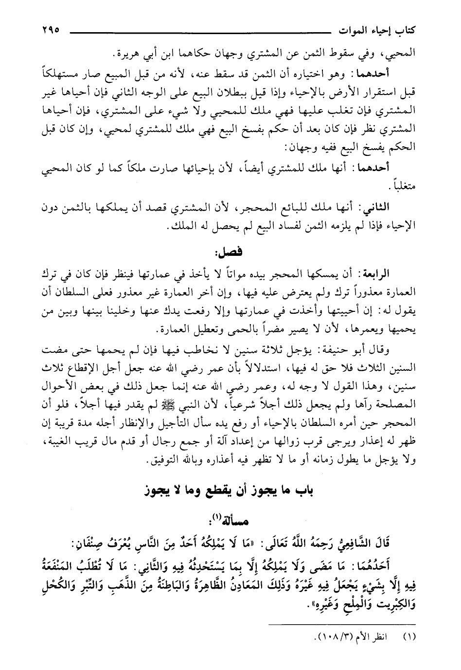 وقال أبو حنيفة: يؤجل ثلاثة سنين لا نخاطب فيها فإن لم يحمها حتى مضت السنين الثلاث فلا حق له فيها، استدلالاً بأن عمر رضي الله عنه جعل أجل الإقطاع ثلاث منين، وهذا القول لا وجه له، وعمر رضي الله عنه إنما جعل ذلك في بعض الأحوال المصلحة رآها ولم يجعل ذلك أجلاً شرعياً، لأن النبي صلى الله عليه وسلم لم يقدر فيها أجلاً, فلو أن المحجر حين أمره السلطان بالإحياء أو رفع يده سأل التأجيل والإنظار أجله مدة قريبة إن ظهر له إعذار ويرجى قرب زوالها من إعداد آلة أو جمع رجال أو قدم مال قريب الغيبة، ولا يؤجل ما يطول زمانه أو ما لا تظهر فيه أعذاره وبالله التوفيق.