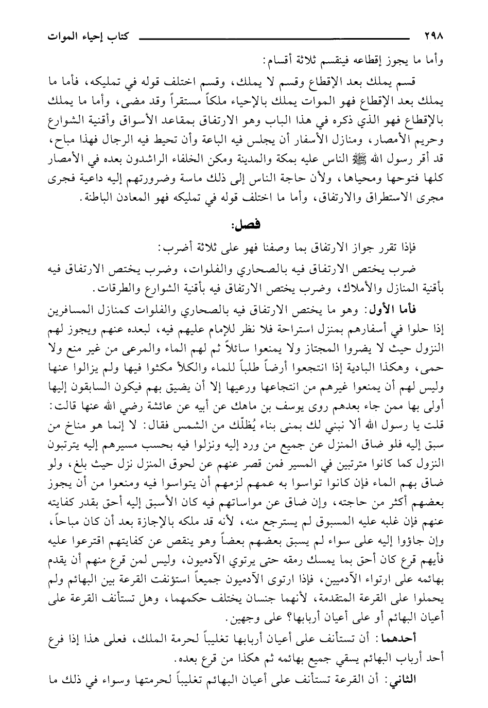 فأما الأول: وهو ما يختص الارتفاق فيه بالصحاري والفلوات كمنازل المسافرين إذا حلوا في أسفارهم بمنزل استراحة فلا نظر للإمام عليهم فيه, لبعده عنهم ويجوز لهم النزول حيث لا يضروا المجتاز ولا يمنعوا سائلاً ثم لهم الماء والمرعى من غير منع ولا حمى، وهكذا البادية إذا انتجعوا أرضاً طلباً للماء والكلأ مكثوا فيها ولم يزالوا عنها وليس لهم أن يمنعوا غيرهم من انتجاعها ورعيها إلا أن يضيق بهم فيكون السابقون إليها أولى بها ممن جاء بعدهم روى يوسف بن ماهك عن أبيه عن عائشة رضي الله عنها قالت: قلت يا رسول الله ألا نبني لك بمنى بناء يظلك من الشمس فقال: لا إنما هو مناخ من سبق إليه فلو ضاق المنزل عن جميع من ورد إليه ونزلوا فيه بحسب مسيرهم إليه يترتبون النزول كما كانوا مترتبين في المسير فمن قصر عنهم عن لحوق المنزل نزل حيث بلغ، ولو ضاق بهم الماء فإن كانوا تواسوا به عمهم لزمهم أن يتواسوا فيه ومنعوا من أن يجوز بعضهم أكثر من حاجته، وان ضاق عن مواساتهم فيه كان الأسبق إليه أحق بقدر كفايته عنهم فإن غلبه عليه المسبوق لم يسترجع منه، لأنه قد ملكه بالإجازة بعد أن كان مباحا، وان جاؤوا إليه على سواء لم يسبق بعضهم بعضاً وهو ينقص عن كفايتهم اقترعوا عليه فأيهم قرع كان أحق بما يمسك رمقه حتى يرتوي الآدميون, وليس لمن قرع منهم أن يقام بهائمه على ارتواء الآدميين، فإذا ارتوى الآدميون جميعا استؤنفت القرعة بين البهائم ولم يحملوا على القرعة المتقدمة، لأنهما جنسان يختلف حكمهما، وهل تستأنف القرعة على أعيان البهائم أو على أعيان أربابها؟ على وجهين.