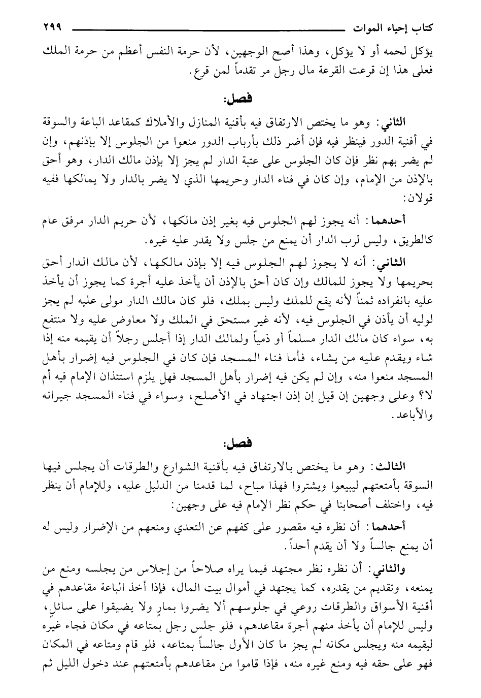 الثاني: وهو ما يختص الارتفاق فيه بأقنية المنازل والأملاك كمقاعد الباعة والسوقة في أفنية الدور فينظر فيه فإن أضر ذلك بأرباب الدور منعوا من الجلوس إلا بإذنهم، وان لم يضر بهم نظر فإن كان الجلوس على عتبة الدار لم يجز إلا بإذن مالك الدار، وهو أحق بالإذن من الإمام، وان كان في فناء الدار وحريمها الذي لا يضر بالدار ولا يمالكها ففيه قولان: