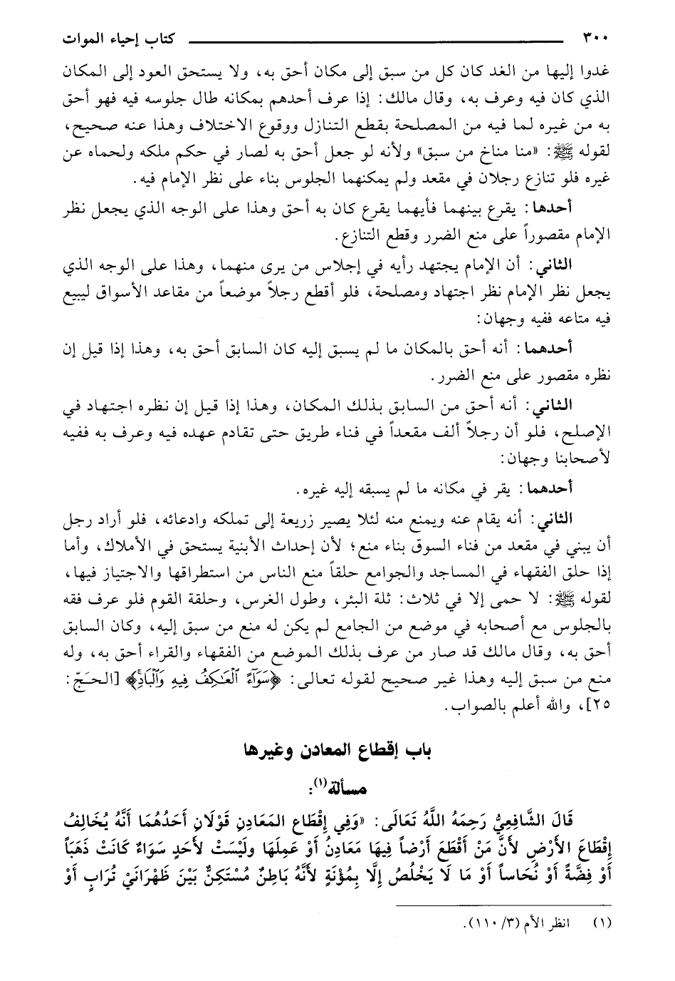 الثاني: أنه يقام عنه ويمنح منه لئلا يصير زريعة إلى تملكه وادعائه، فلو أراد رجل أن يبني في مقعد من فناء السوق بناء منع, لأن إحداث الأبنية يستحق في الأملاك، وأما إذا حلق الفقهاء في المساجد والجوامع حلقاً منح الناس من استطراقها والاجتياز فيها، لقوله صلى الله عليه وسلم: لا حمى إلا في ثلاث: ثلة البئر، وطول الغرس، وحلقة القوم فلو عرف فقه بالجلوس مع أصحابه في موضع من الجامح لم يكن له منع من سبق إليه، وكان السابق أحق به، وقال مالك قد صار من عرف بذلك الموضح من الفقهاء والقراء أحق به، وله منع من سبق إليه وهذا غير صحيح لقوله تعالى: {سَوَاءً العَاكِفُ فِيهِ وَالْبَادِ} [الحج: (25)]، والله أعلم بالصواب.
