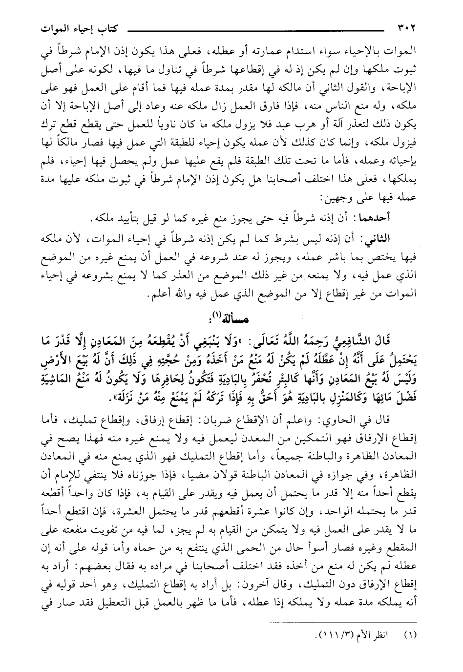 قَالَ الشَّافِعِيُّ رَحِمَهُ اللهُ تَعَالَى: "وَلَا يَنْبَغِي أَنْ يُقْطِعَهُ مِنَ الْمَعَادِنِ إِلَّا قَدْرَ مَا يَحْتَمِلُ، عَلَى أَنَّهُ إِنْ عَطَّلَهُ لَمْ يَكُنْ لَهُ مَنْعٌ مِنْ أَخْذِهِ، وَمِنْ حُجَّتِهِ فِي ذَلِكَ أَنَّ لَهُ بَيْعَ الْأَرْضِ، وَلَيْسَ لَهُ بَيْعُ الْمَعَادِنِ، وَأَنَّهَا كَالْبِئْرِ تُحْفَرُ بِالْبَادِيَةِ فَتَكُونُ لِحَافِرِهَا، وَلَا يَكُونُ لَهُ مَنْعُ الْمَاشِيَةِ فَضْلَ مَائِهَا، وَكَالْمَنْزِلِ بِالْبَادِيَةِ هُوَ أَحَقُّ بِهِ، فَإِذَا تَرَكَهُ لَمْ يَمْنَعْ مِنْهُ مَنْ نَزَلَهُ".