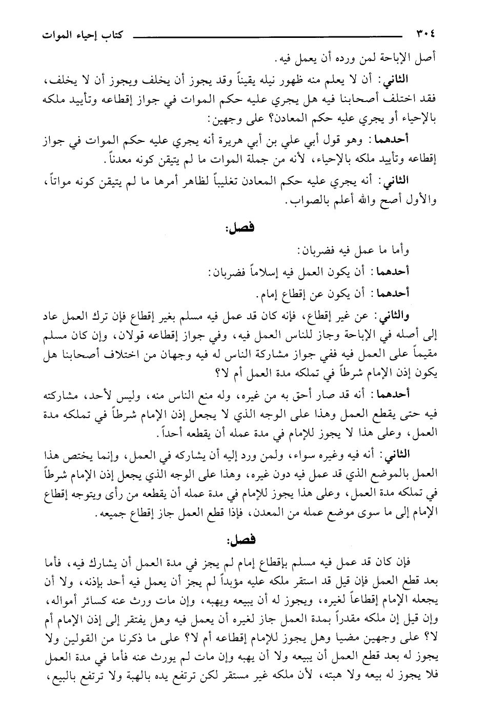 والثاني: عن غير إقطاع، فإنه كان قد عمل فيه مسلم بغير إقطاع فإذ ترك العمل عاد إلى أصله في الإباحة وجاز للناس العمل فيه، وفي جواز إقطاعه قولان، وان كان مسلم مقيماً على العمل فيه ففي جواز مشاركة الناس له فيه وجهان من اختلاف أصحابنا هل يكون إذن الإمام شرطاً في تملكه مدة العمل أم لا؟