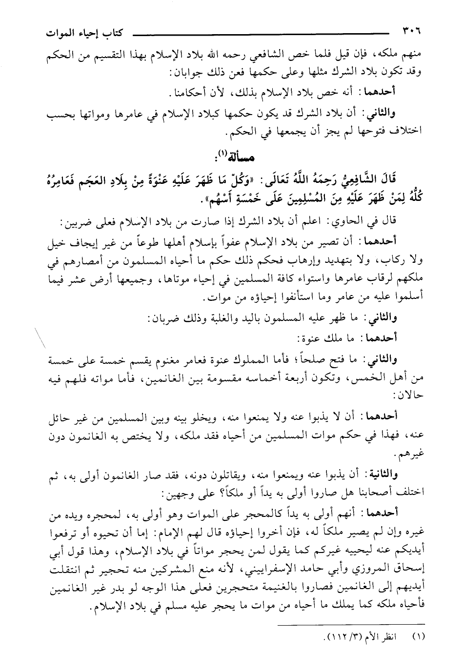 قَالَ الشَّافِعِيُّ رَحِمَهُ اللهُ تَعَالَى: "وَكُلُّ مَا ظُهِرَ عَلَيْهِ عَنْوَةً مِنْ بِلَادِ الْعَجَمِ فَعَامِرُهُ كُلُّهُ لِمَنْ ظَهَرَ عَلَيْهِ مِنَ الْمُسْلِمِينَ عَلَى خَمْسَةِ أَسْهُمٍ ".