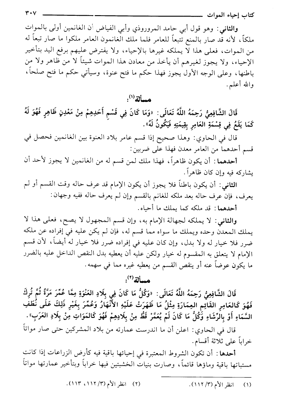 قَالَ الشَّافِعِيُّ رَحِمَهُ اللهُ تَعَالَى: "وَكُلُّ مَا كَانَ فِي بِلَادِ الْعَنْوَةِ مِمَّا عُمِرَ مَرَّةً ثُمَّ تُرِكَ فَهُوَ كَالْعَامِرِ الْقَائِمِ الْعِمَارَةِ، مِثْلَ مَا ظَهَرَتْ عَلَيْهِ الْأَنْهَارُ، وَعُمِرَ بِغَيْرِ ذَلِكَ عَلَى نَطْفِ السَّمَاءِ أَوْ بِالرِّشَاءِ، وَكُلُّ مَا كَانَ لَمْ يُعْمَرْ قَطُّ مِنْ بِلَادِهِمْ فَهُوَ كَالْمَوَاتِ مِنْ بِلَادِ الْعَرَبِ".