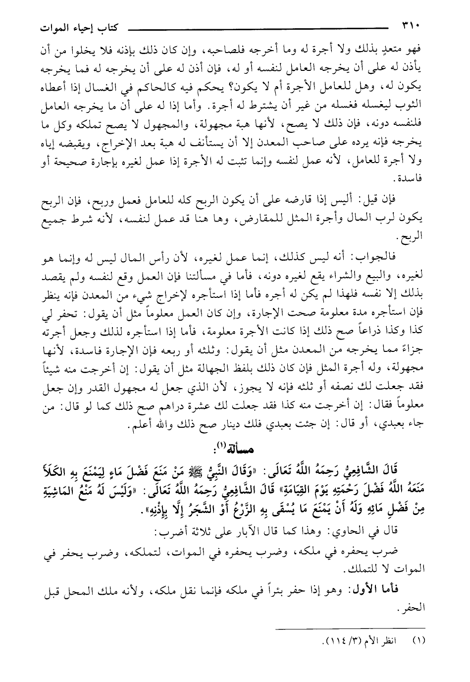 قَالَ الشَّافِعِيُّ رَحِمَهُ اللهُ تَعَالَى: "وَقَالَ النَّبِيُّ صَلَّى اللَّهُ عَلَيْهِ وَسَلَّمَ: " مَنْ مَنَعَ فَضْلَ مَاءٍ لِيَمْنَعَ بِهِ الْكَلَأَ مَنَعَهُ اللَّهُ فَضْلَ رَحْمَتِهِ يَوْمَ الْقِيَامَةِ ".قَالَ الشَّافِعِيُّ رَحِمَهُ اللَّهُ: "وَلَيْسَ لَهُ مَنْعُ الْمَاشِيَةِ مِنْ فَضْلِ مَائِهِ، وَلَهُ أَنْ يَمْنَعَ مَا يُسْقَى بِهِ الزَّرْعُ أَوِ الشَّجَرُ إِلَّا بِإِذْنِهِ".