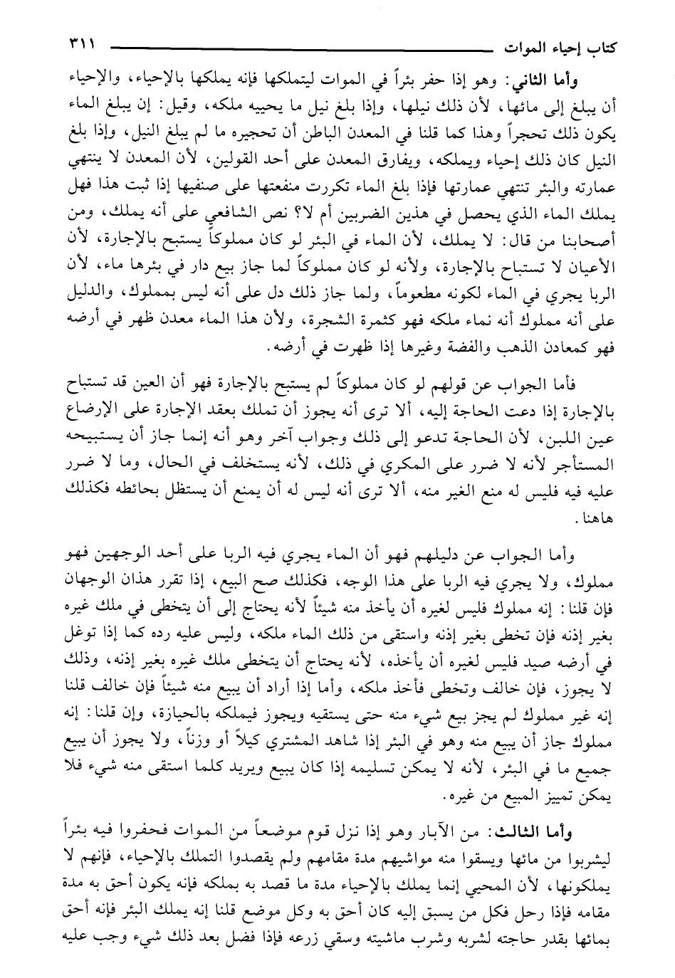 وأما الثاني: وهو إذا حفر بئرًا في الموات ليتملكها فإنه يملكها بالإحياء، والإحياء أن يبلغ إلى مائها، لأن ذلك نيلها، وإذا بلغ نيل ما يحييه ملكه، وقيل: إن يبلغ الماء يكون ذلك تحجرًا وهذا كما قلنا في المعدن الباطن أن تحجيره ما لم يبلغ النيل، وإذا بلغ النيل كان ذلك إحياء ويملكه، ويفارق المعدن على أحد القولين، لأن المعدن لا ينتهي عمارته والبئر تنتهي عمارتها فإذا بلغ الماء تكررت منفعتها على صنفيها إذا ثبت هذا فهل يملك الماء الذي يحصل في هذين الضربين أم لا؟ نص الشافعي على أنه يملك، ومن أصحابنا من قال: لا يملك، لأن الماء في البئر لو كان مملوكًا يستبح بالإجارة، لأن الأعيان لا تستباح بالإجارة، ولأنه لو كان مملوكًا لما جاز بيع دار في بئرها ماء، لأن الربا يجري في الماء لكونه مطعومًا، ولما جاز ذلك دل على أنه ليس بمملوك، والدليل على أنه مملوك أنه نماء ملكه فهو كثمرة الشجرة، ولأن هذا الماء معدن ظهر في أرضه فهو كمعادن الذهب والفضة وغيرها إذا ظهرت في أرضه.