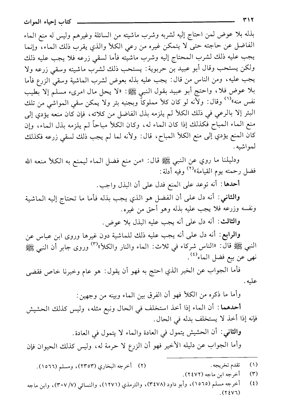 والرابع: أنه دل على أنه يجب عليه ذلك للماشية دون غيرها وروى ابن عباس عن النبي ... صلى الله عليه وسلم قال: "الناس شركاء في ثلاث: الماء والنار والكلأ" وروى جابر أن النبي صلى الله عليه وسلم نهى عن بيع فضل الماء.