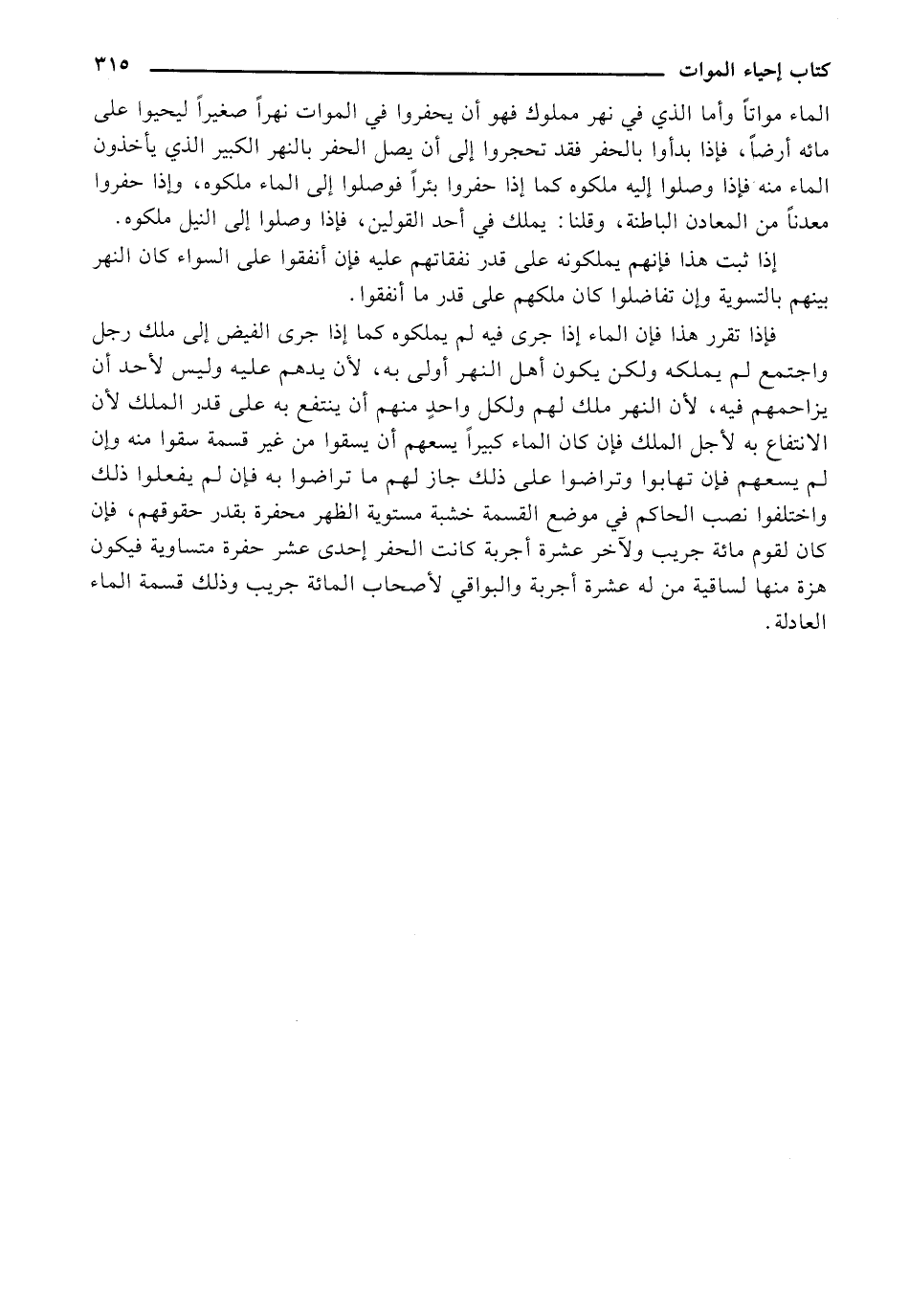 الماء مواتًا وأما الذي في نهر مملوك فهو أن يحفروا في الموات نهرًا صغيرًا ليحيوا على مائه أرضًا، فإذا بدأوا بالحفر فقد تحجروا إلى أن يصل الحفر بالنهر الكبير الذي يأخذون الماء منه فإذا وصلوا إليه ملكوه كما إذا حفروا بئرًا فوصلوا إلى الماء ملكوه، وإذا حفروا معدنًا من المعادن الباطنة، وقلنا: يملك في أحد القولين، فإذا وصلوا إلى النهر ملكوه.