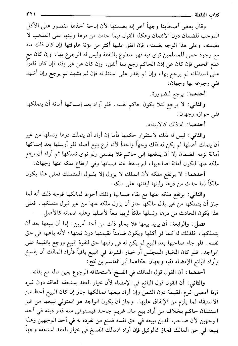 والثاني: أن القول قول البائع في الإمضاء لأن خيار العقد يستحقه العاقد دون غيره فإذا أمضى غرم القيمة دون الثمن وإن أراد بيعها لمالكها جاز إن كان البيع أحظ من الاستبقاء لما يلزم من الإنفاق عليها. وجاز أن يكون الواجد هو المتولي لبيعها من غير استئذان حاكم بخلاف من أراد بيع مال غريم جاحد فيستوفي منه قدر دينه في أحد الوجهين لأن صاحب الدين يبيعه في حق نفسه فمنع من تفرده به في أحد الوجهين وهذا يبيعه في حق المالك فجاز كالوكيل فإن أراد المالك الفسخ في خيار العقد استحقه وجهًا