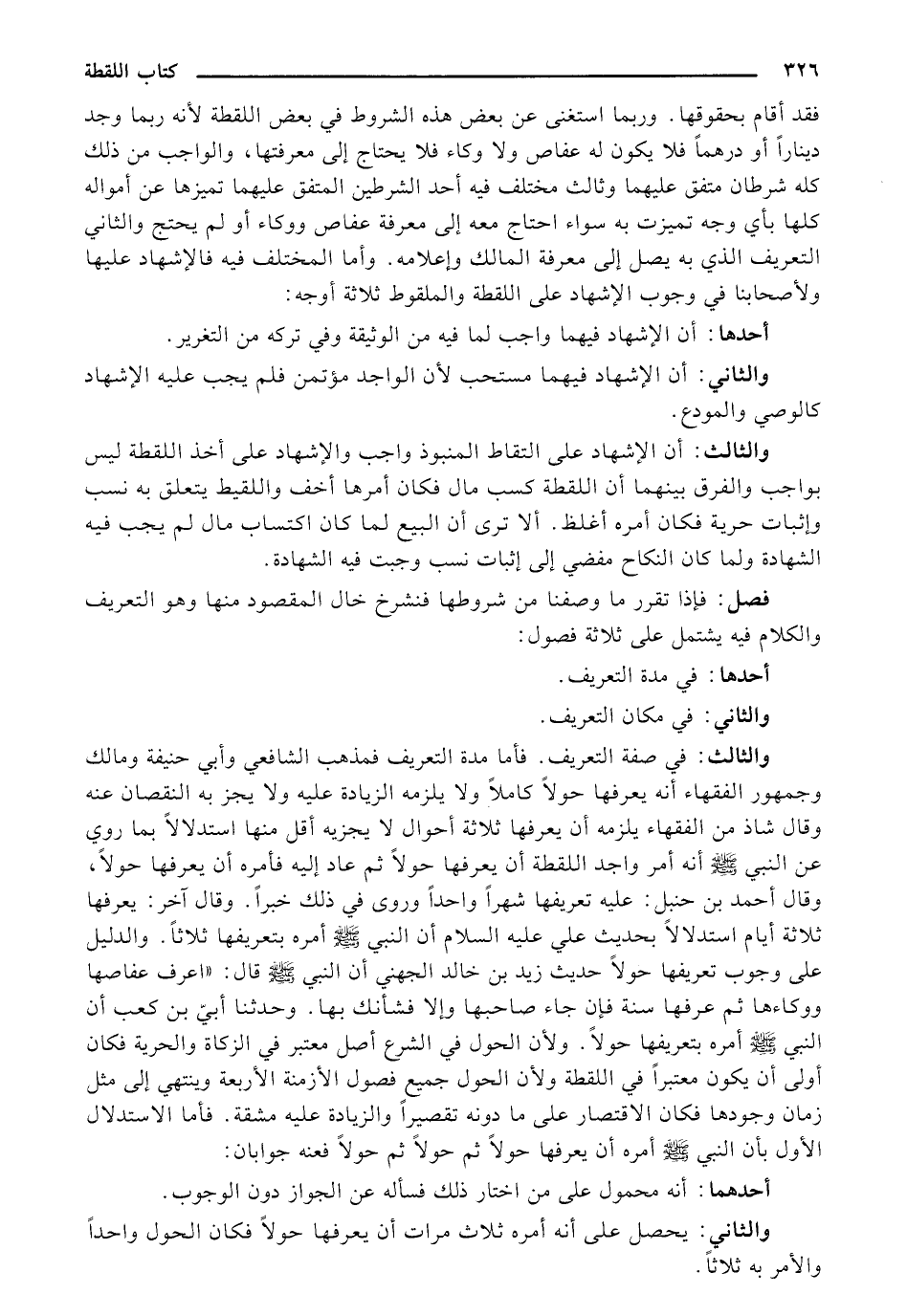 فقد أقام بحقوقها. وربما استغنى عن بعض هذه الشروط في بعض اللقطة لأنه ربما وجد دينارًا أو درهمًا فلا يكون له عفاص ولا وكاء فلا يحتاج إلى معرفتها، والواجب من ذلك كله شرطان متفق عليهما وثالث مختلف فيه أحد الشرطين المتفق عليهما تميزها عن أمواله كلها بأي وجه تميزت به سواء احتاج معه إلى معرفة عفاص ووكاء أو لم يحتج والثاني التعريف الذي به يصل إلى معرفة المالك وإعلامه. وأما المختلف فيه فالإشهاد عليها ولأصحابنا في وجوب الإشهاد على اللقطة والملقوط ثلاثة أوجه: