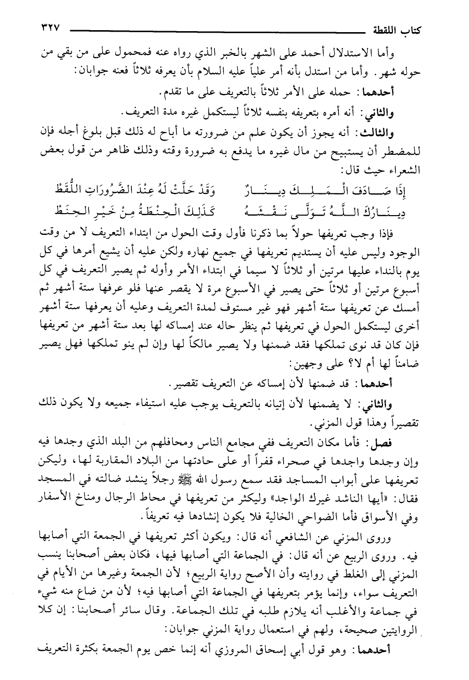 فصل: فأما مكان التعريف ففي مجامع الناس ومحافلهم من البلد الذي وجدها فيه وإن وجدها واجدها في صحراء قفرًا أو على حادتها من البلاد المقاربة لها، وليكن تعريفها على أبواب المساجد فقد سمع رسول الله صلى الله عليه وسلم رجلًا ينشد ضالته في المسجد فقال: «أيها الناشد غيرك الواجد» وليكثر من تعريفها في محاط الرجال ومناخ الأسفار وفي الأسواق فأما الضواحي الخالية فلا يكون إنشادها فيه تعريفًا.