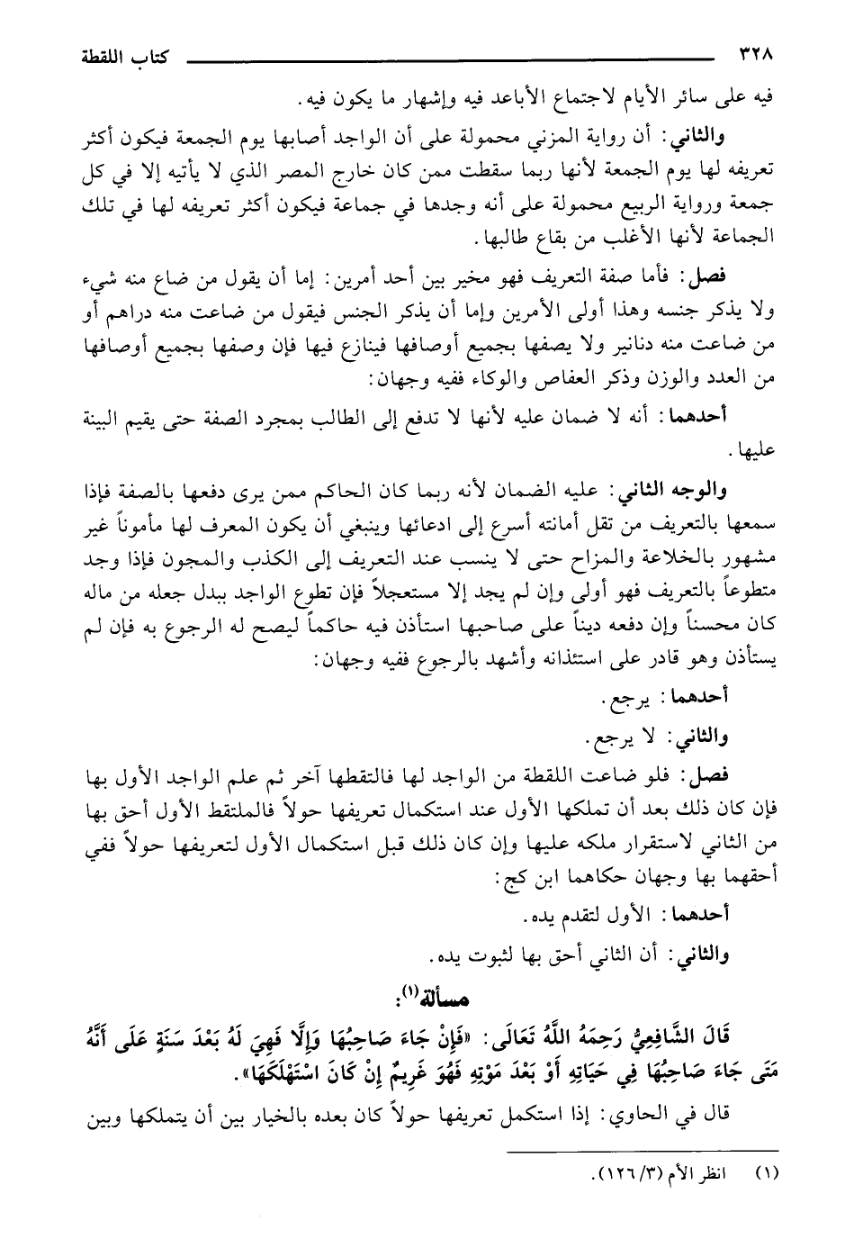 والثاني: أن رواية المزني محمولة على أن الواجد أصابها يوم الجمعة فيكون أكثر تعريفه لها يوم الجمعة لأنها ربما سقطت ممن كان خارج المصر الذي لا يأتيه إلا في كل جمعة ورواية الربيع محمولة على أنه وجدها في جماعة فيكون أكثر تعريفه لها في تلك الجماعة لأنها الأغلب من بقاع طالبها.